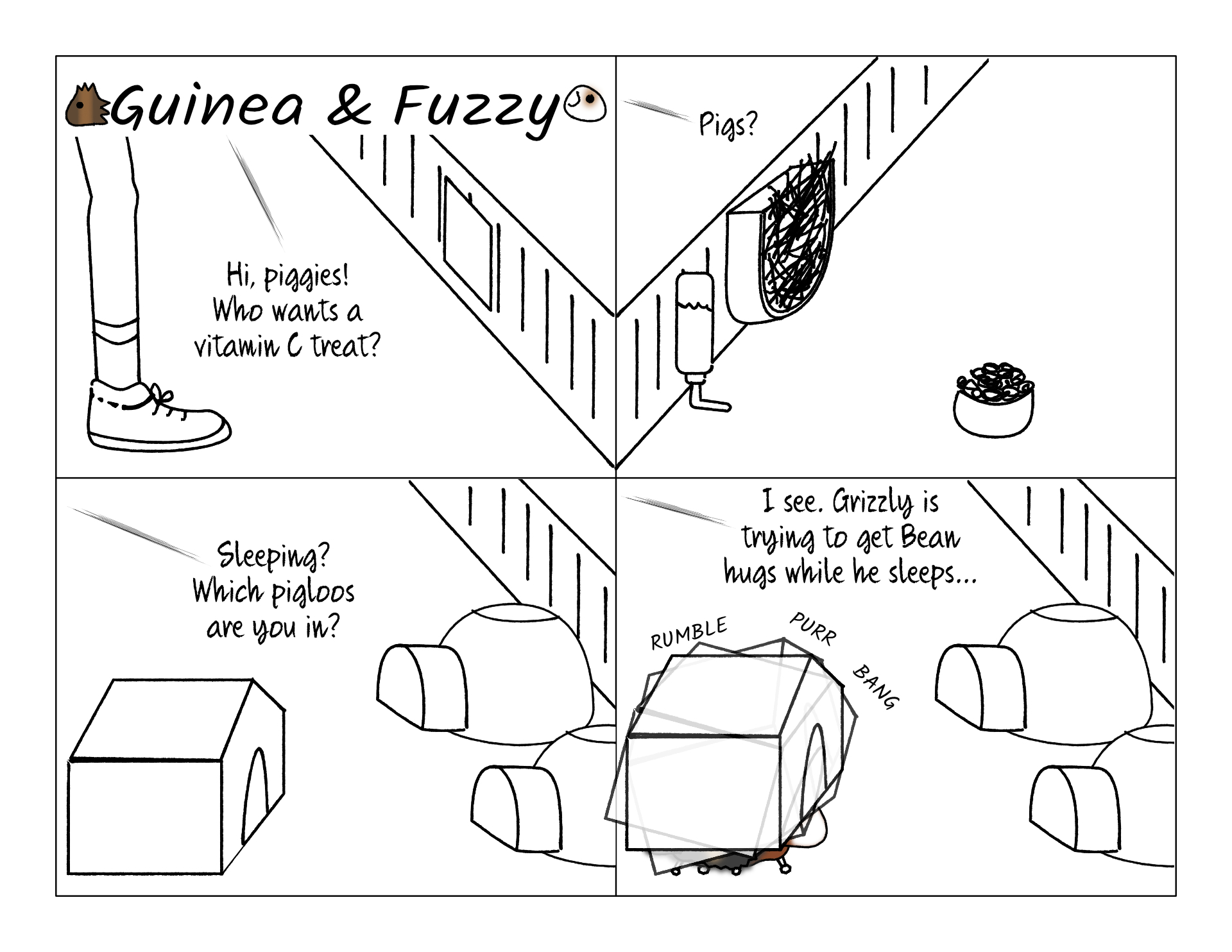It's not surprising that Grizzly would cuddle up to Bean while they sleep. He really doesn't like to be separated from his new friend. Bean was a little shy about it, so Grizzly would sneak into the pigloo while Bean was sleeping.