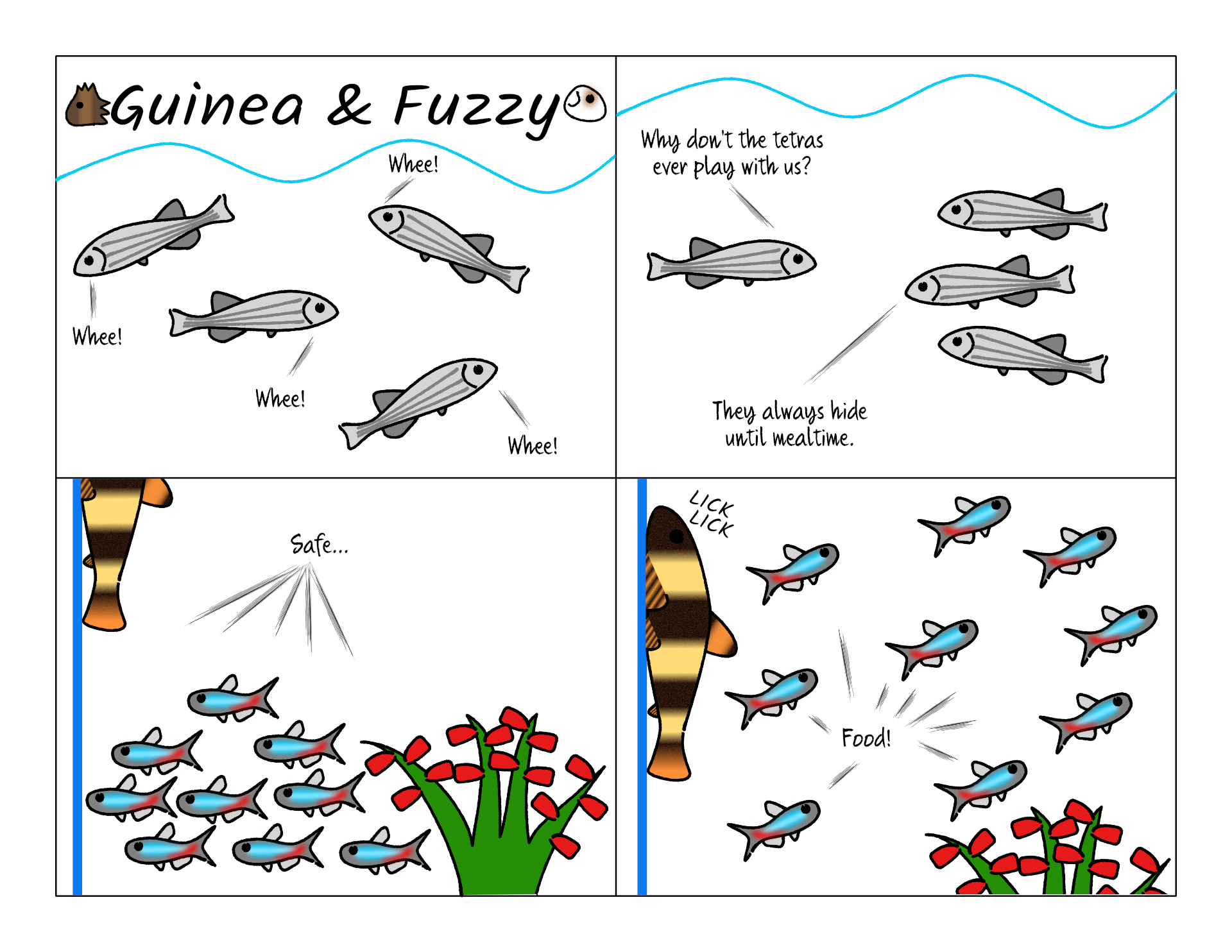 The tetras have their favorite spot in the tank, over in the corner, behind the sunken submarine (which is now a sunken Focke Wulf 190). Apparently because they naturally live in the Amazon river and like to hide in the shade of the jungle trees that hang over the side of the river. So they pick a similarly shady spot and all school together. Meanwhile the danios chase each other around and have tons of fun up near the top of the water, just like dolphins.