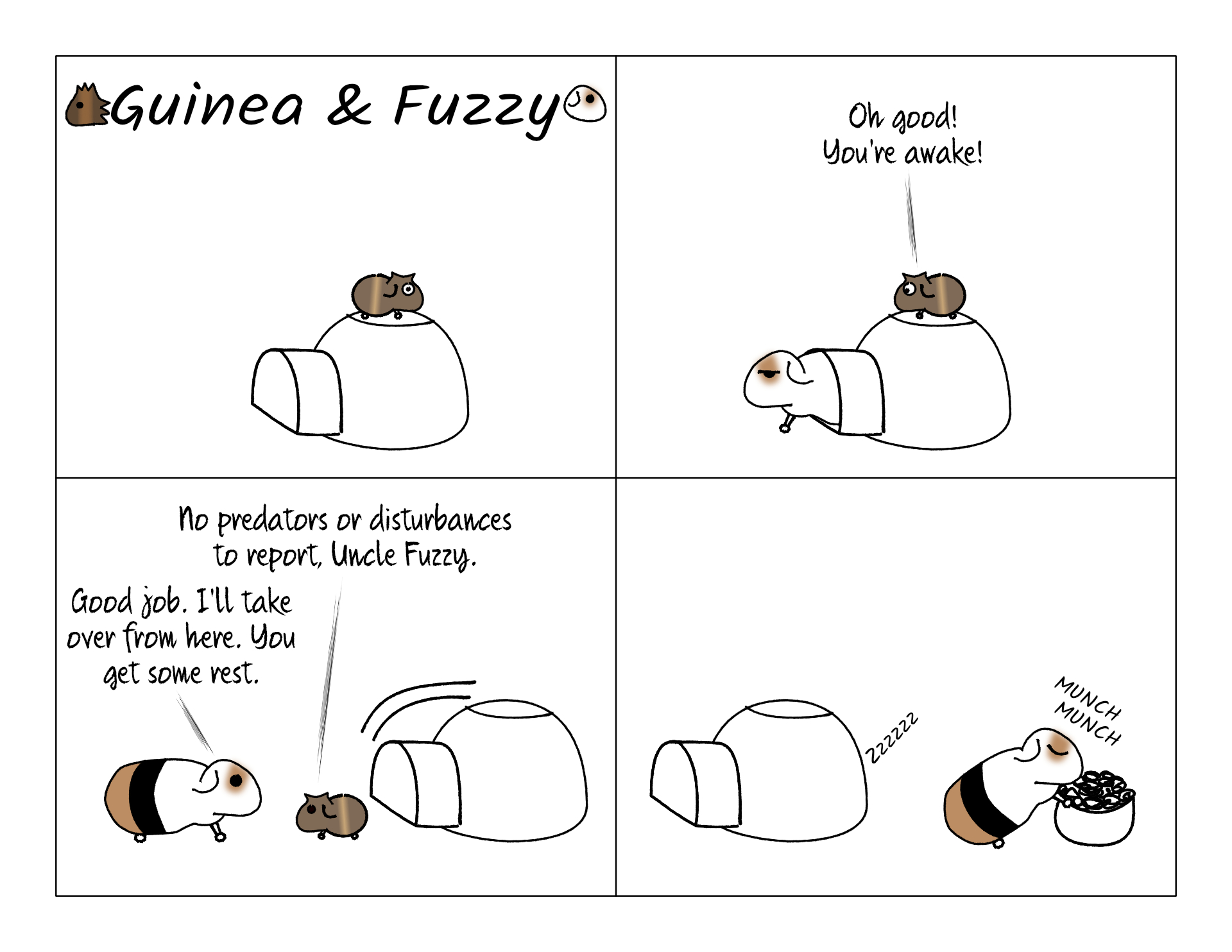 Potato always guards the cage while the other two pigs are sleeping. And eventually when they wake up and they're out and about, his shift is over and he can sleep or relax and eat some hay. Hopefully Fuzzy enjoys the peace of mind knowing that he has an early warning system for any dangerous.