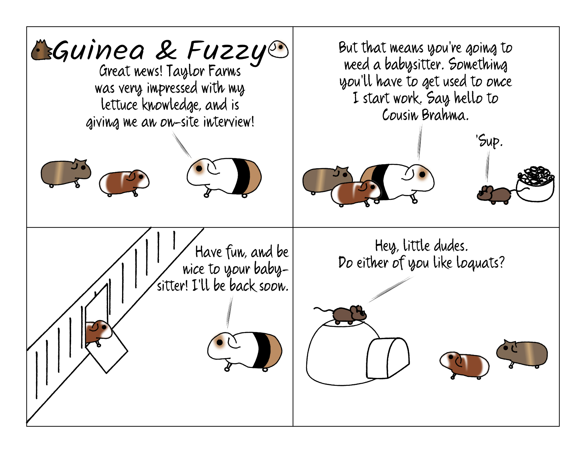 We're proud of Fuzzy for successfully getting an interview, but Brahma isn't the best choice of babysitter. In general, we don't invite mice into the house. Unless they're trained pets of course.