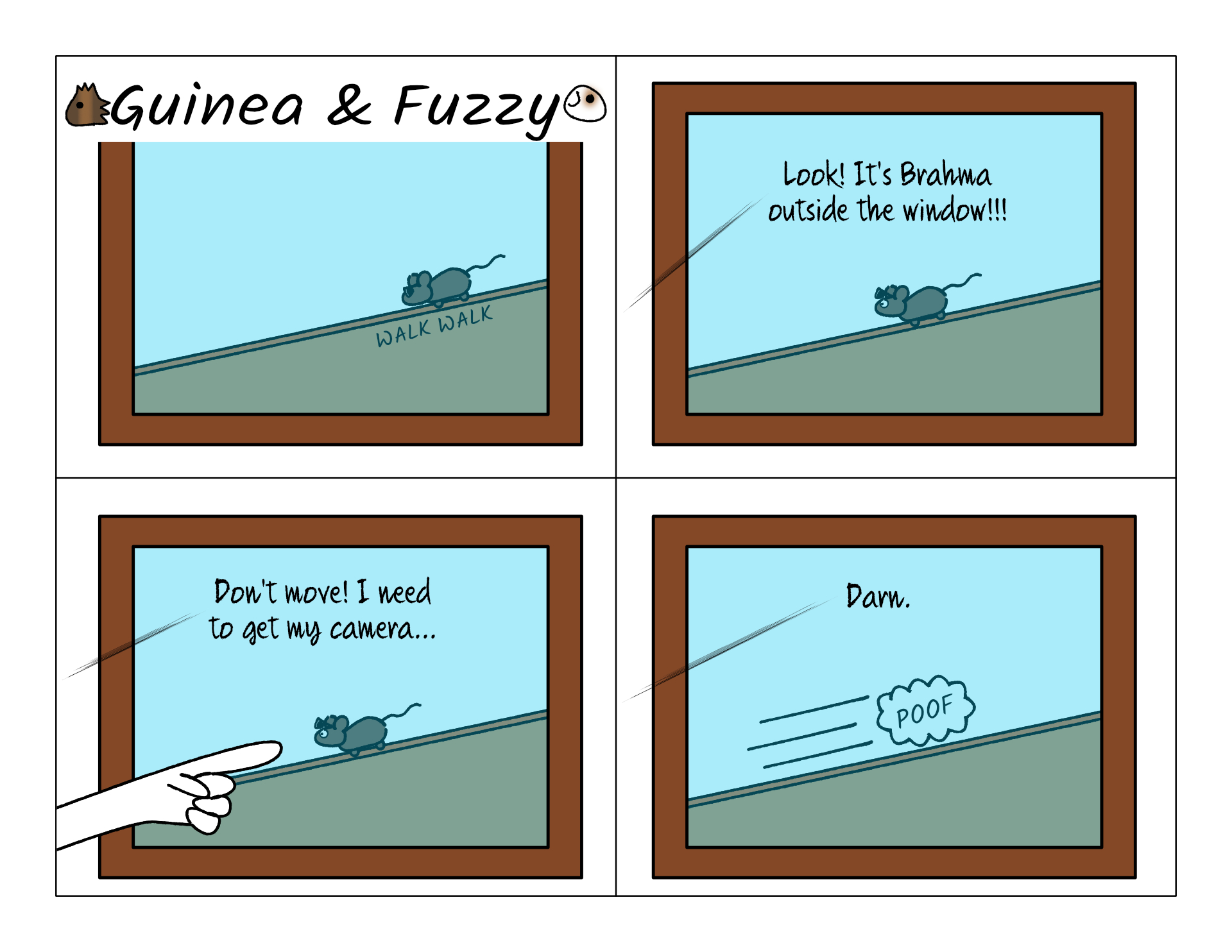 I was in the kitchen putting away some dishes, when Brahma walked along the fence, right on the other side of the window, only a few feet away! I yelled, "Brahma!" Instead of running away, he just froze and stared at me.