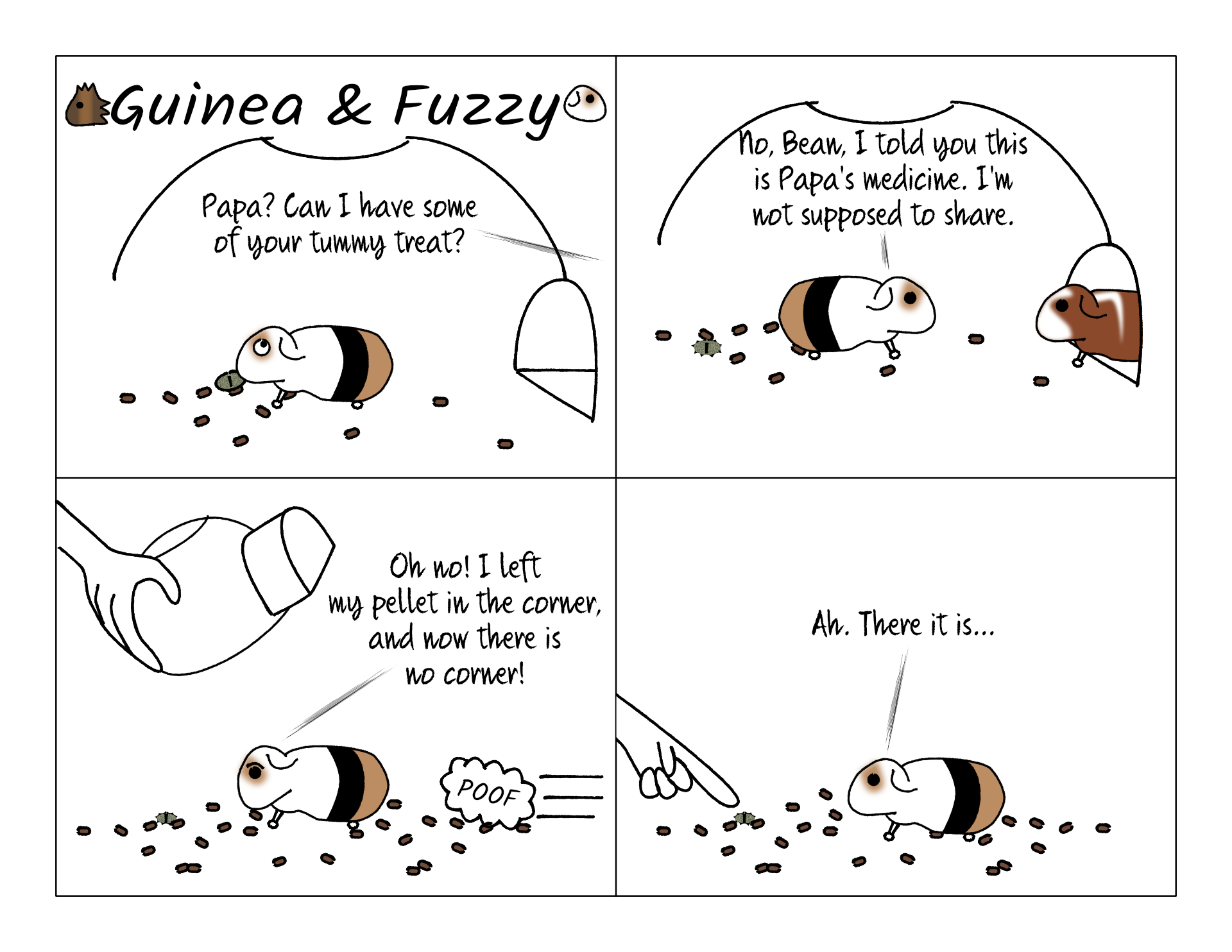 Guinea pig eyes are designed to look up and out, to better protect themselves from predators. In fact they have nearly 360 degree vision all around them. The disadvantage is they can't really look down, especially at the ground right in front of them. That short furry nose is in the way. But Fuzzy usually remembers right where he left some food, even if he can't look down to see it. He walks over near where he left it, then sniffs or whiskers the ground until he finds it.