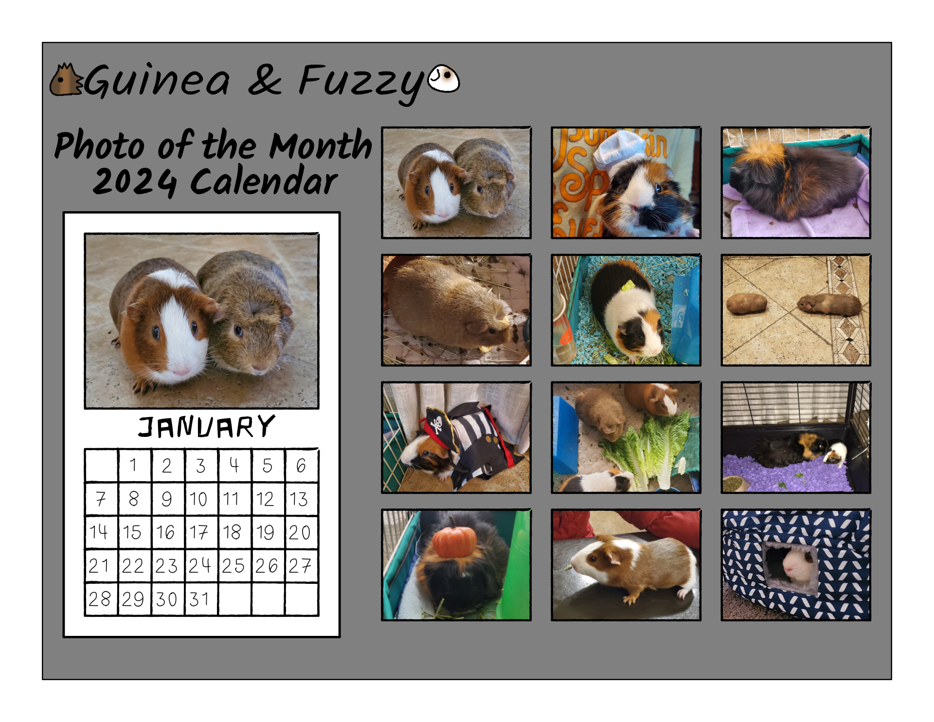 Happy New Year! Here's a hypothetical 2024 calendar featuring the guinea pig cast of Guinea and Fuzzy in real life! From the top row to the bottom: Jan: Bean and Potato Feb: Chef Fuzzy Mar: Guinea Relaxing Apr: Potato Wearing a Loquat Skin May: Fuzzy Wearing Romaine Jun: Potato and a Potato Jul: Captain Fuzzy Aug: Dinnertime Sep: Guinea Meets Fuzzy for the First Time Oct: Halloween Guinea Nov: Bean at the Dinner Table Dec: Bean in His Christmas Present