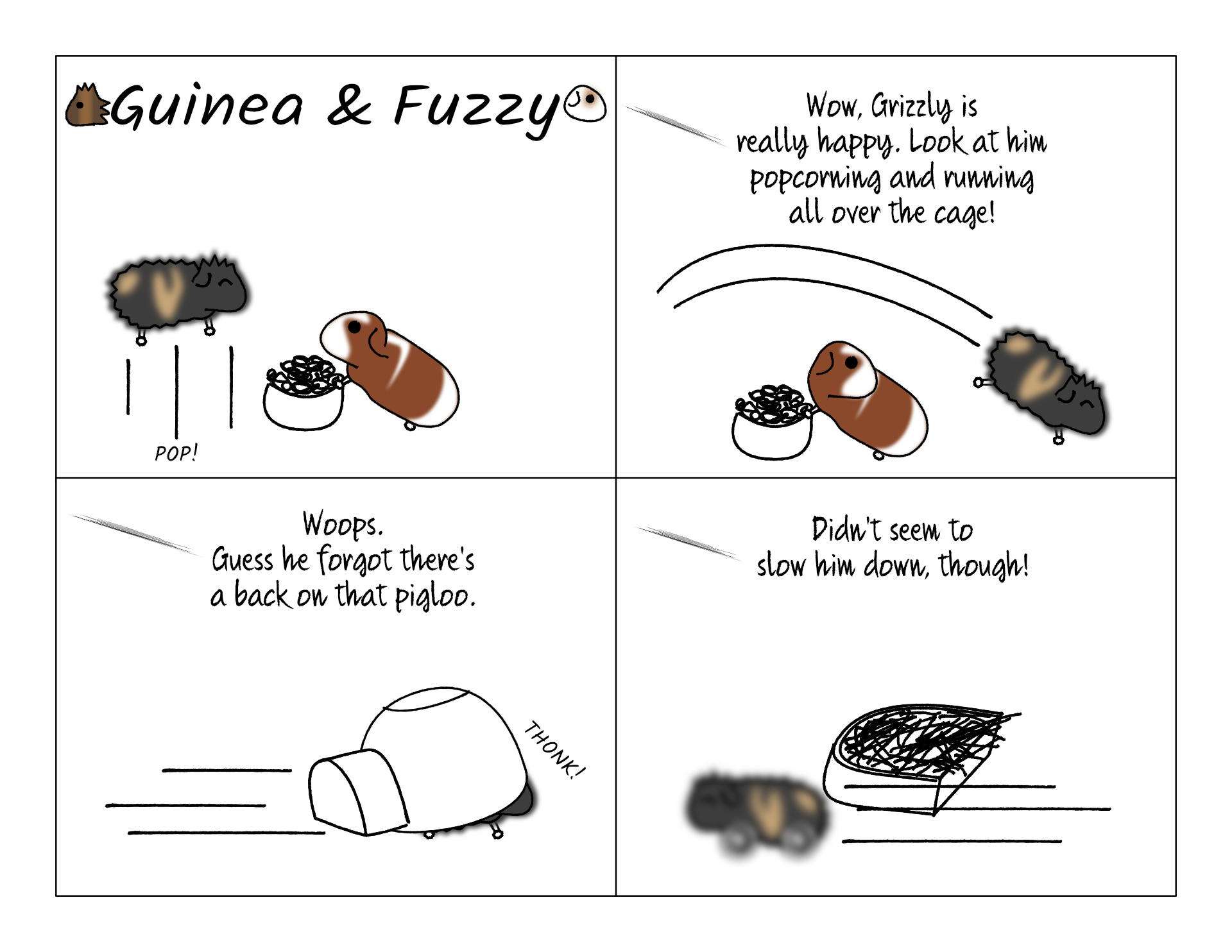 All of the pigs tend to do this: run into things when they're running around. If they're not smashing into the back of a pigloo, they're banging against the side of the cage while running past. It never seems to bother them. But Grizzly even does it when he's exercising, or super happy.