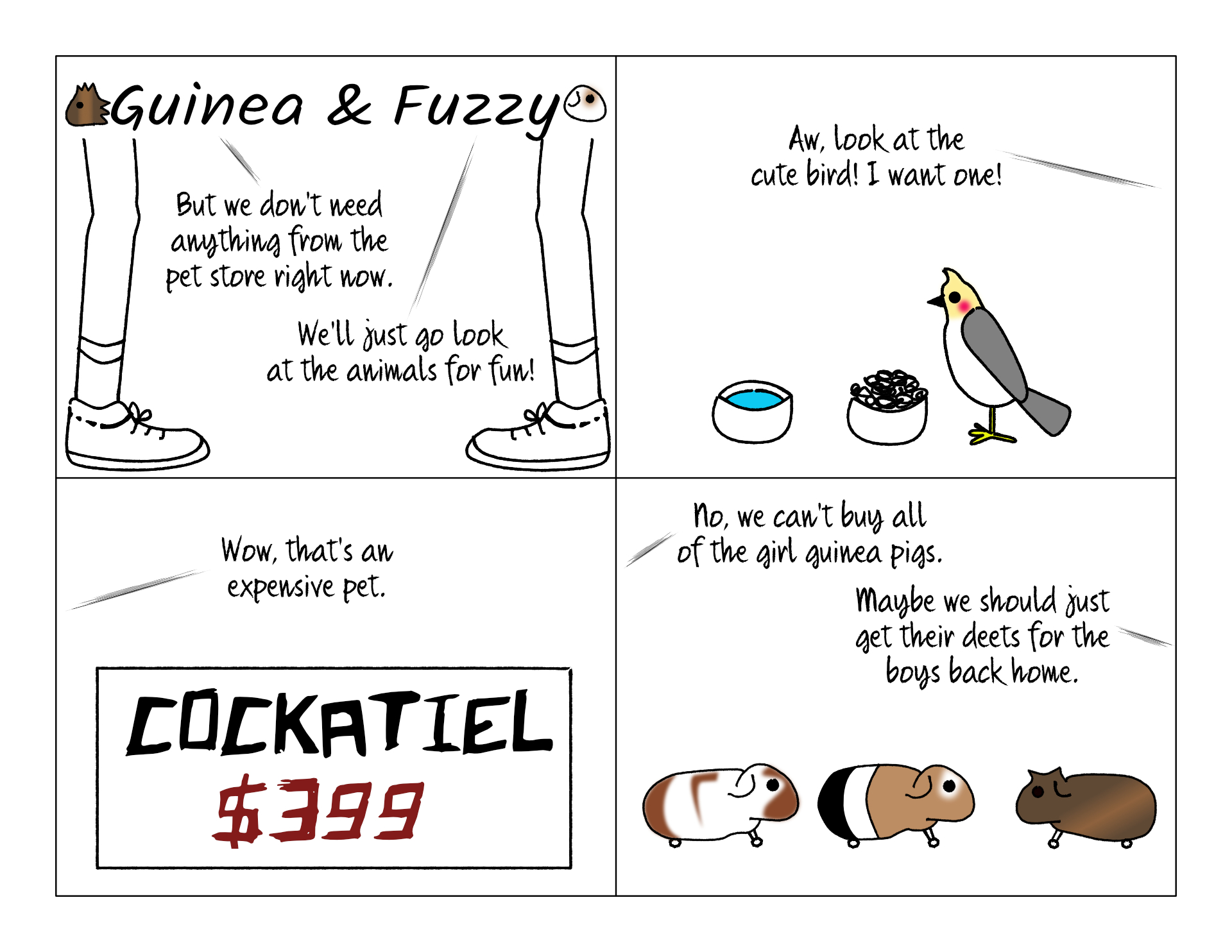 Even though we have to go to the pet store for supplies once in a while, we still like to go there sometimes when we don't need anything, just to window shop. It's fun to see all the different animals. Checking out birds is neat, because none of us has ever owned one and they're very different from other pets. But the big ones cost a fortune!