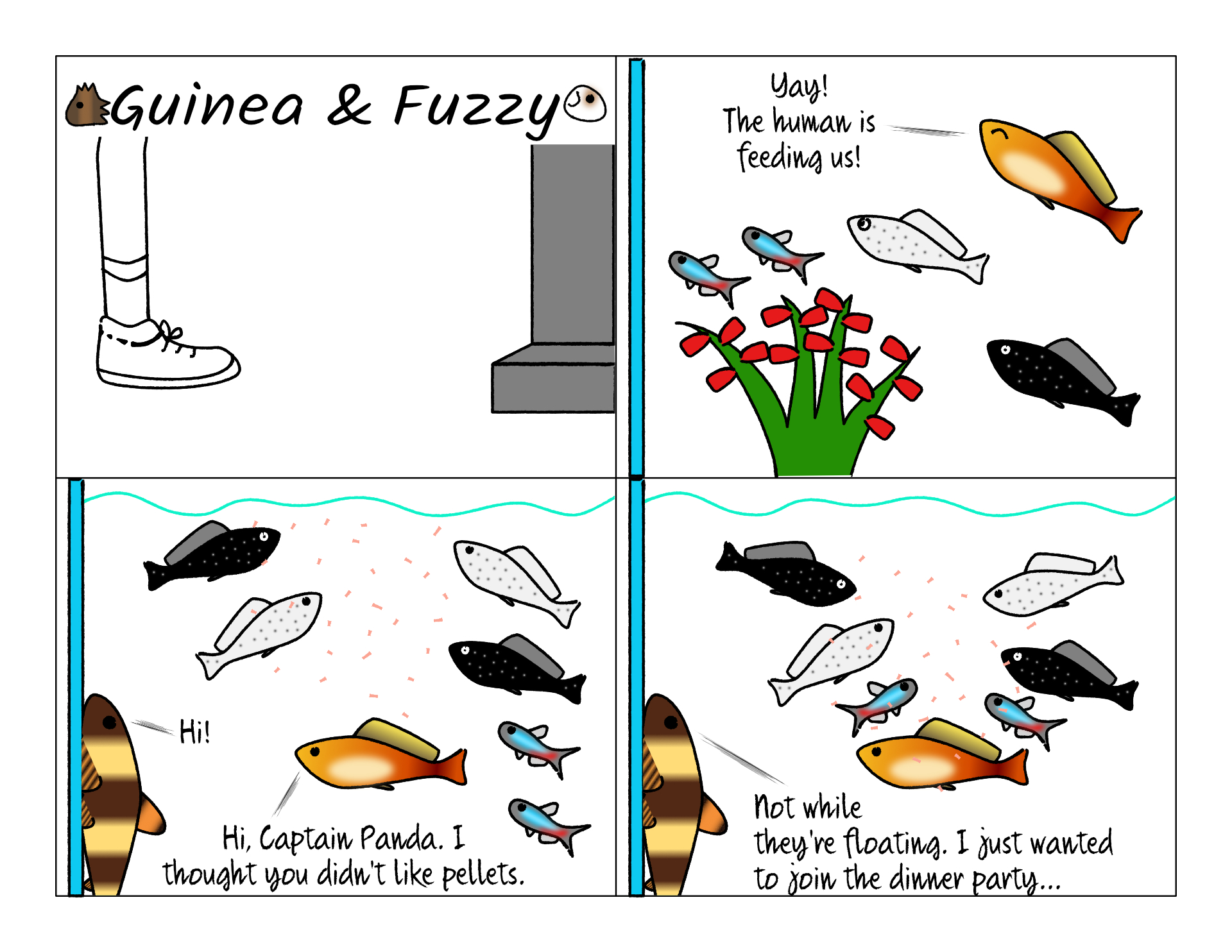 Captain Panda is a "bottom feeder." Or more often known among aquarium enthusiasts as "clean-up crew." That means she likes to suck things out of the gravel at the bottom of the tank, or link the walls of the tank for algae and biofilm. I think she does eat some pellets off the ground along with other things, but she never tries to catch them as they're falling.