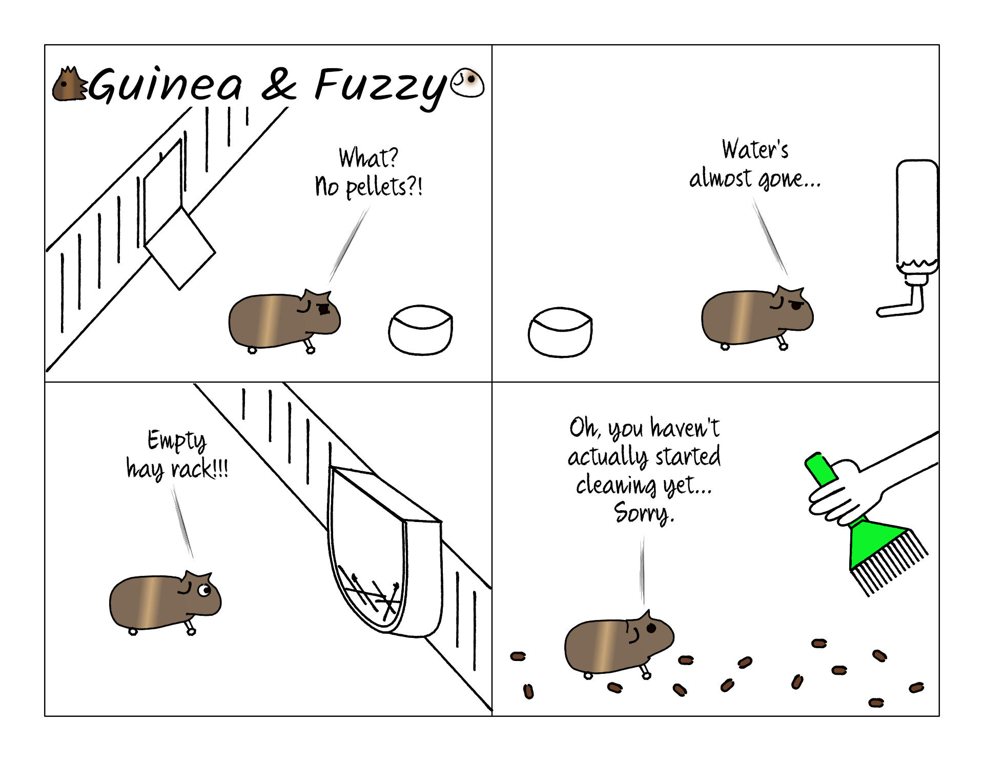 Sometimes Potato arrives early to inspect the cage while I'm still cleaning it. I think that's why he still does it. Once in a while he gets to the pellet bowl before I've refilled it, so when I do refill it, he's proud of himself for reminding me.