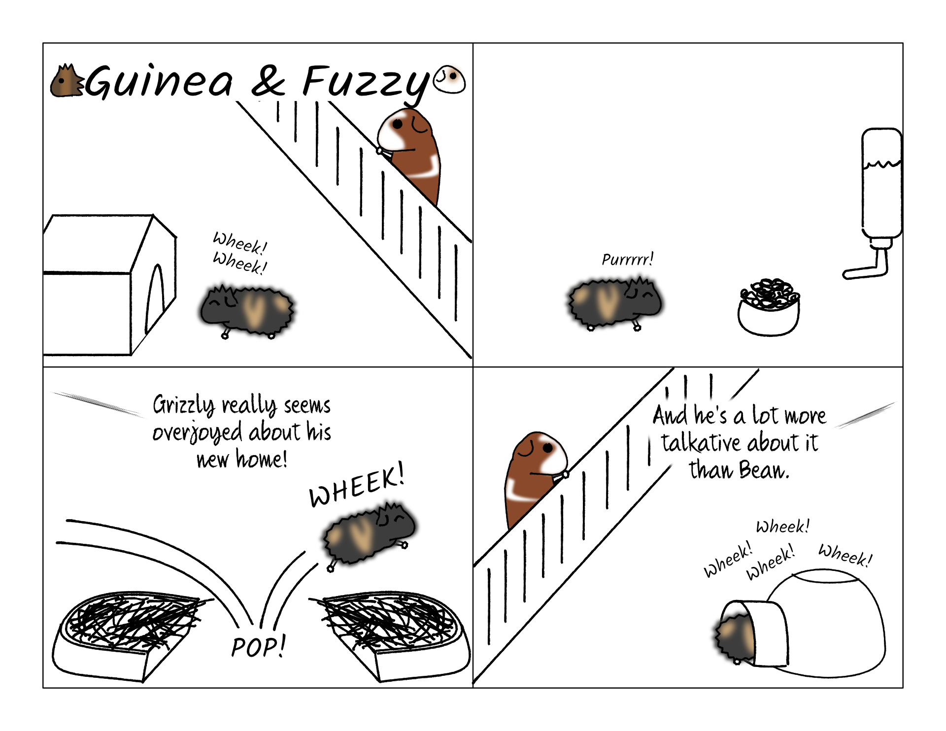 Grizzly was super excited and happy about his new home. He kept running around and wheeking, popcorning constantly, checking out each pigloo and pellet bowl over and over again. I think he couldn't believe he had so much space to himself, plus all these new things. And he was chattering, wheeking, and purring the whole time.