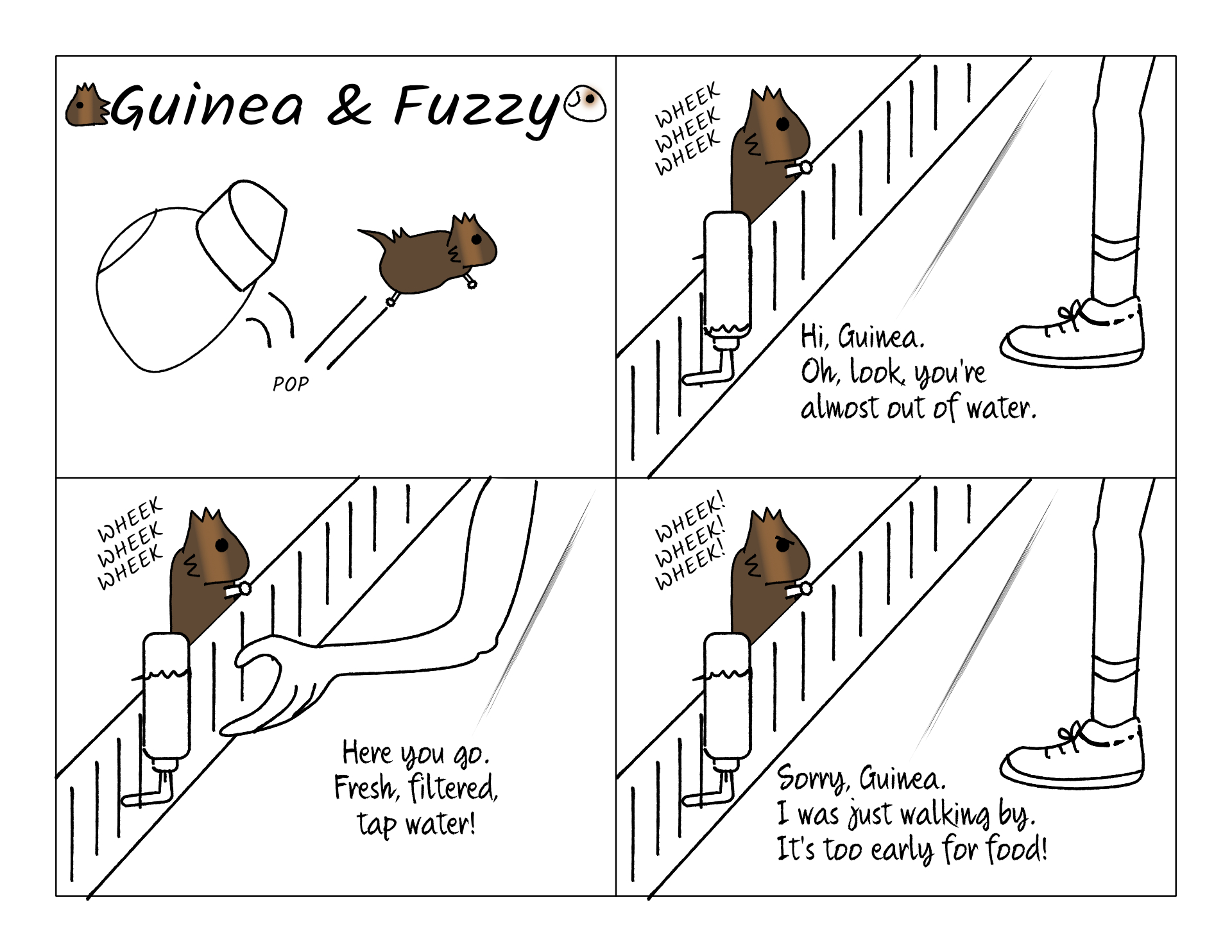 As mentioned in previous comics, the piggies will often get excited just when we walk by. Let alone when we actually walk up to them and stop! They don't really drink a ton of water, so a water bottle refill is not what they're expecting. They want veggies!