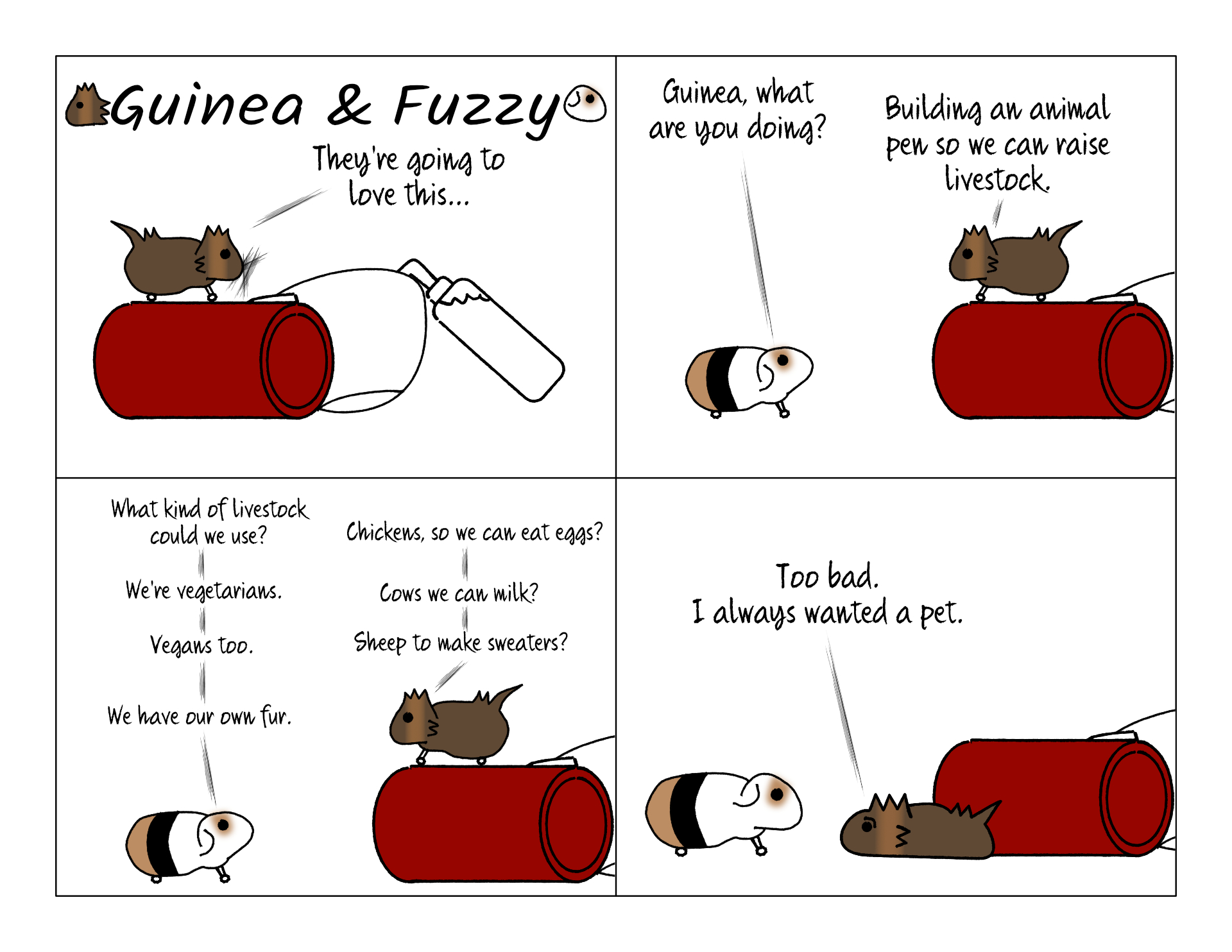 What kind of pet would a pet guinea pig have? Probably not a chicken, that sounds dangerous. Definitely not a cow. They'd be competing for hay! Maybe a small lizard or chameleon?
