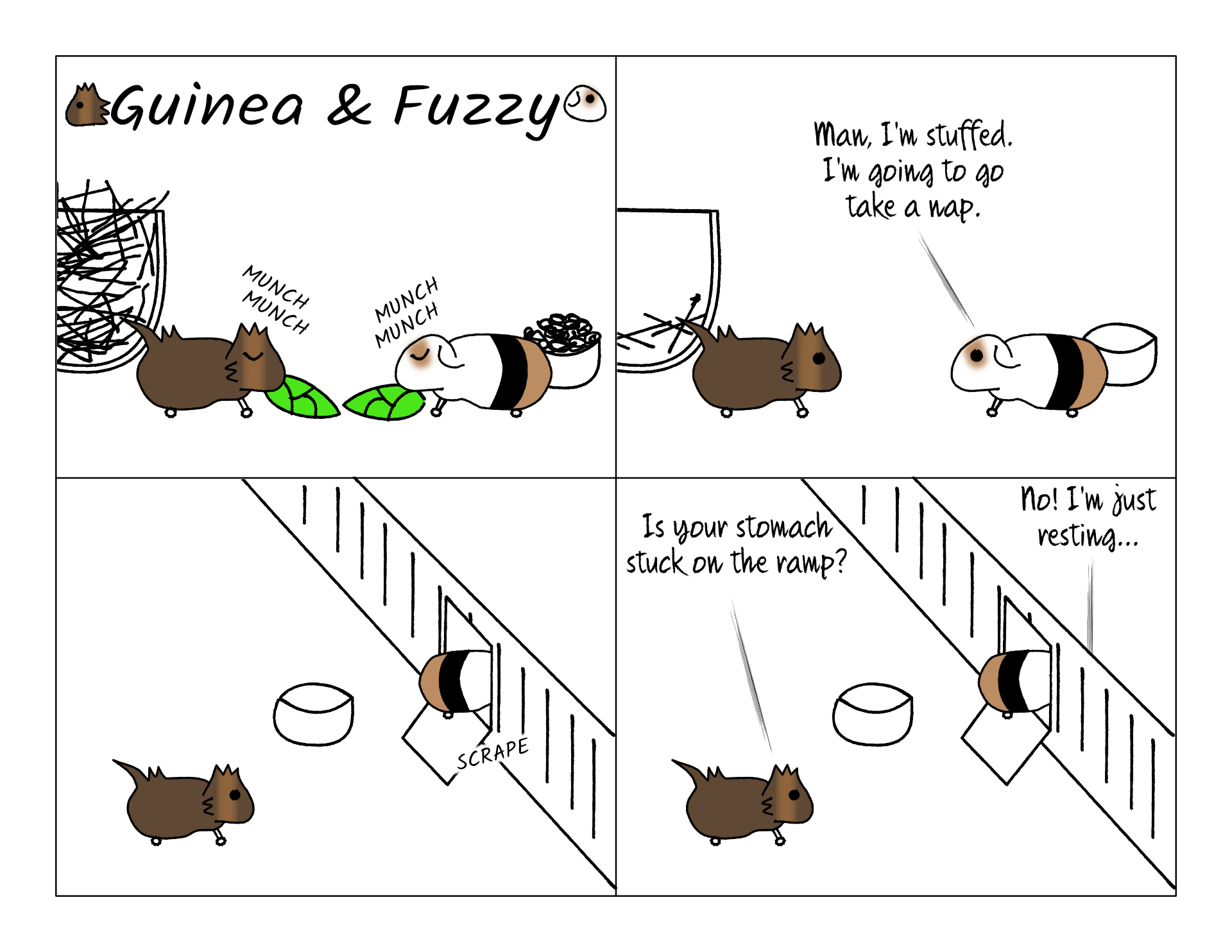 We were just having dinner and her a thump and a squeak... Fuzzy was trying to walk between cages and was dragging his belly over the hump on the ramp.