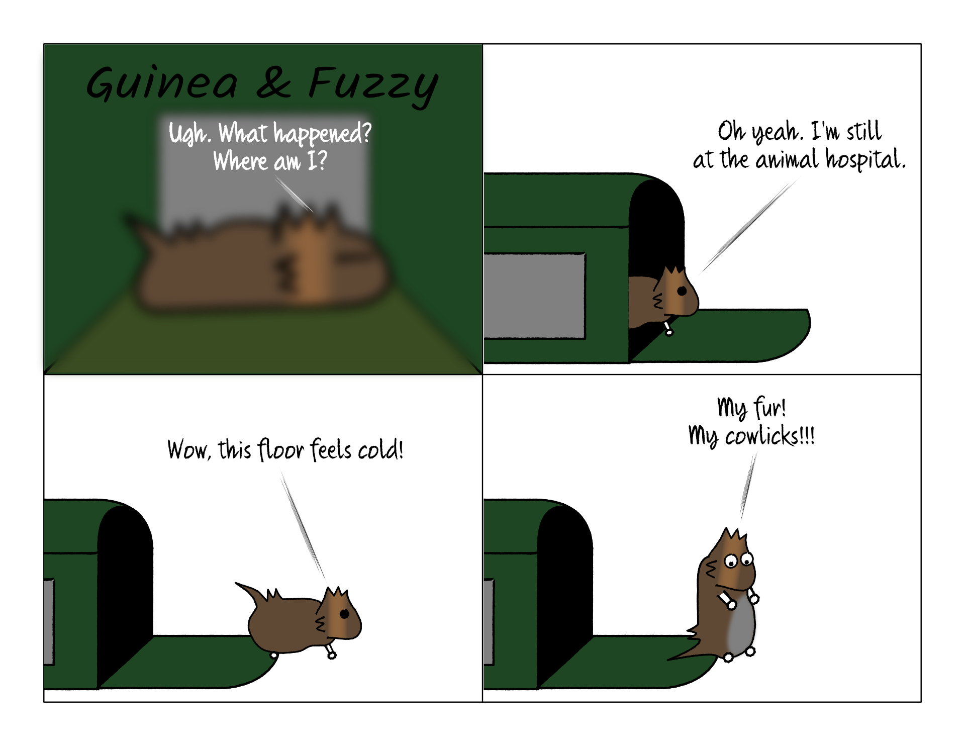 It wasn't until Guinea's second trip to the specialist, actually, but they wanted to upgrade from an x-ray to an ultrasound of his condition. He was a good pig, who was cooperative with the doctors. Again he was there for quite a while while they prepped, and he let them sedate him for the procedure. What none of us knew, but makes sense when you think about it, was that they were going to shave his fur on his underside! I suppose so they could get better contact with the ultrasound.