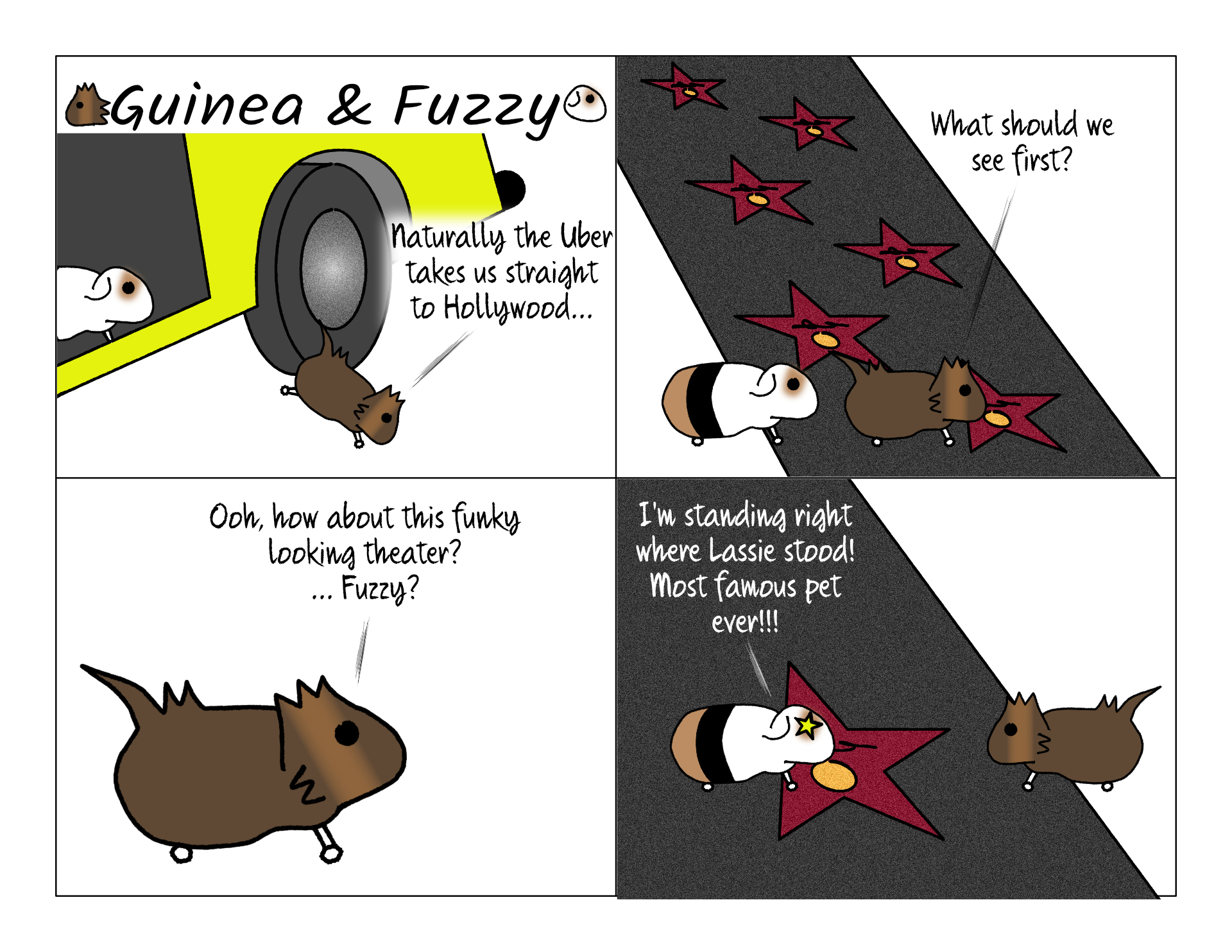 I think I'm safe in saying that Lassie is the most famous fictional pet ever? Who competes? Hedwig? Ol' Yeller? Lassie is definitely in the most movies. And she does actually have a star on Hollywood Boulevard. But there are no footprints on it, as there aren't on any of the stars on the Walk of Fame. The footprints are actually at the Chinese Theater.
