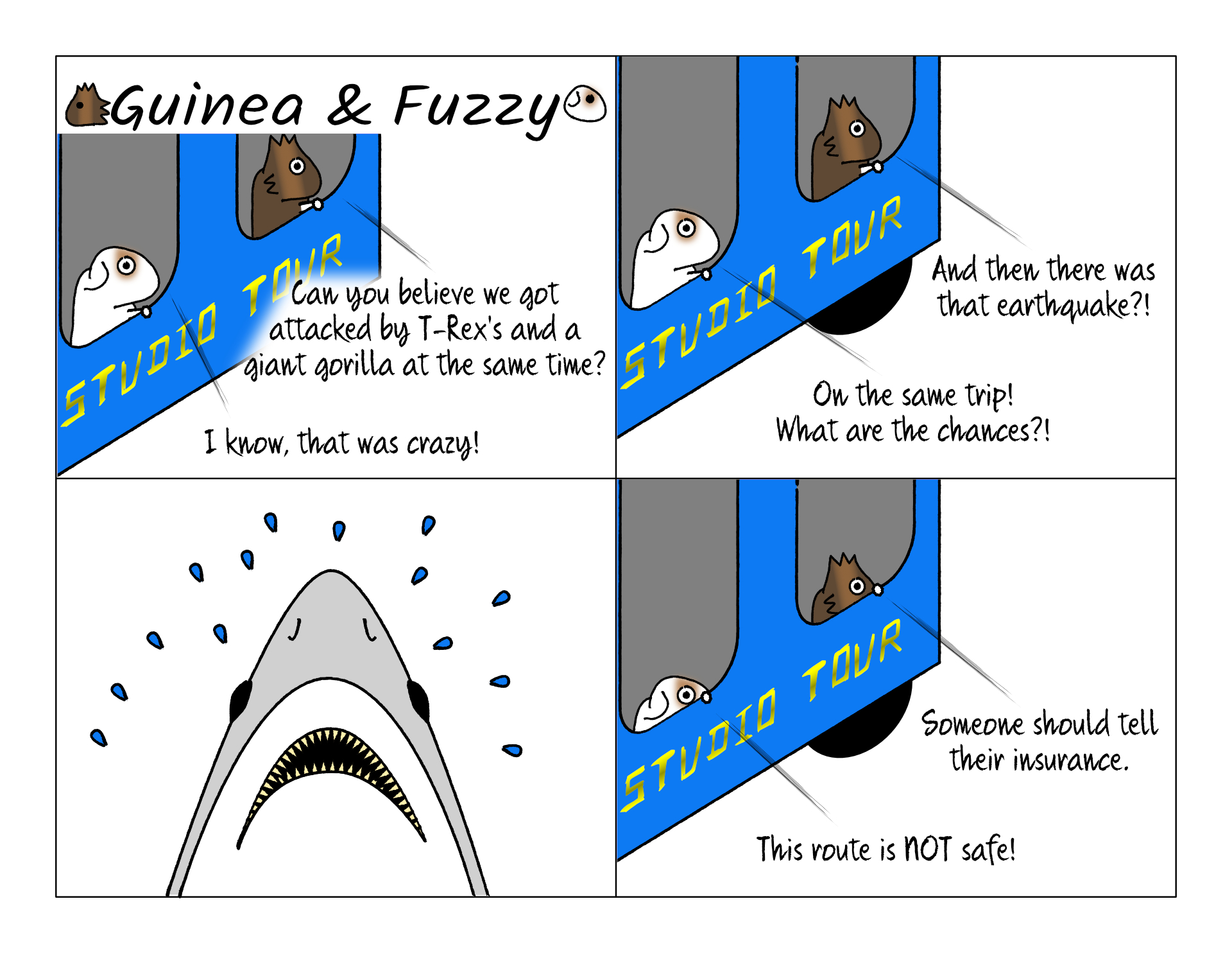 What would be the scariest part of the Universal Studios tour for guinea pigs? They've been in real earthquakes before, though not ones that resulted in the subway collapsing on them. And they live right next to Captain Panda, who looks a little like a tiny shark. And the new 3D King Kong is nowhere near as convincing as the old animatronic one. Maybe the rain and flood demo. They might get wet!