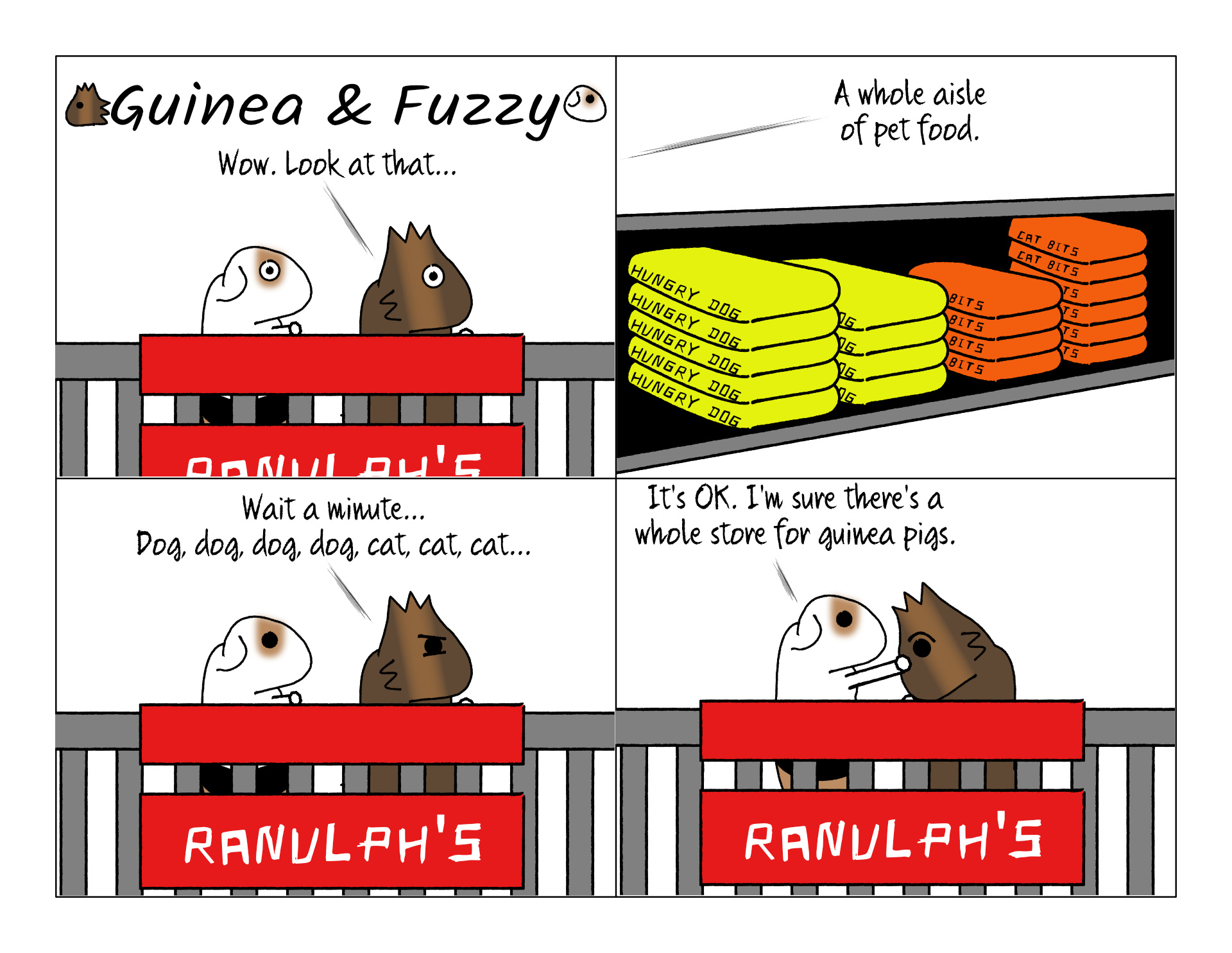 Even actual pet stores are like this. Most have guinea pig food. In what they call the "small animal" section. Which is usually one aisle. Then there's an aisle for birds, one for reptiles, and one for fish. The other 15 or so aisles are for cats and dogs. And that's the big stores! The small ones wouldn't even have a guinea pig section!