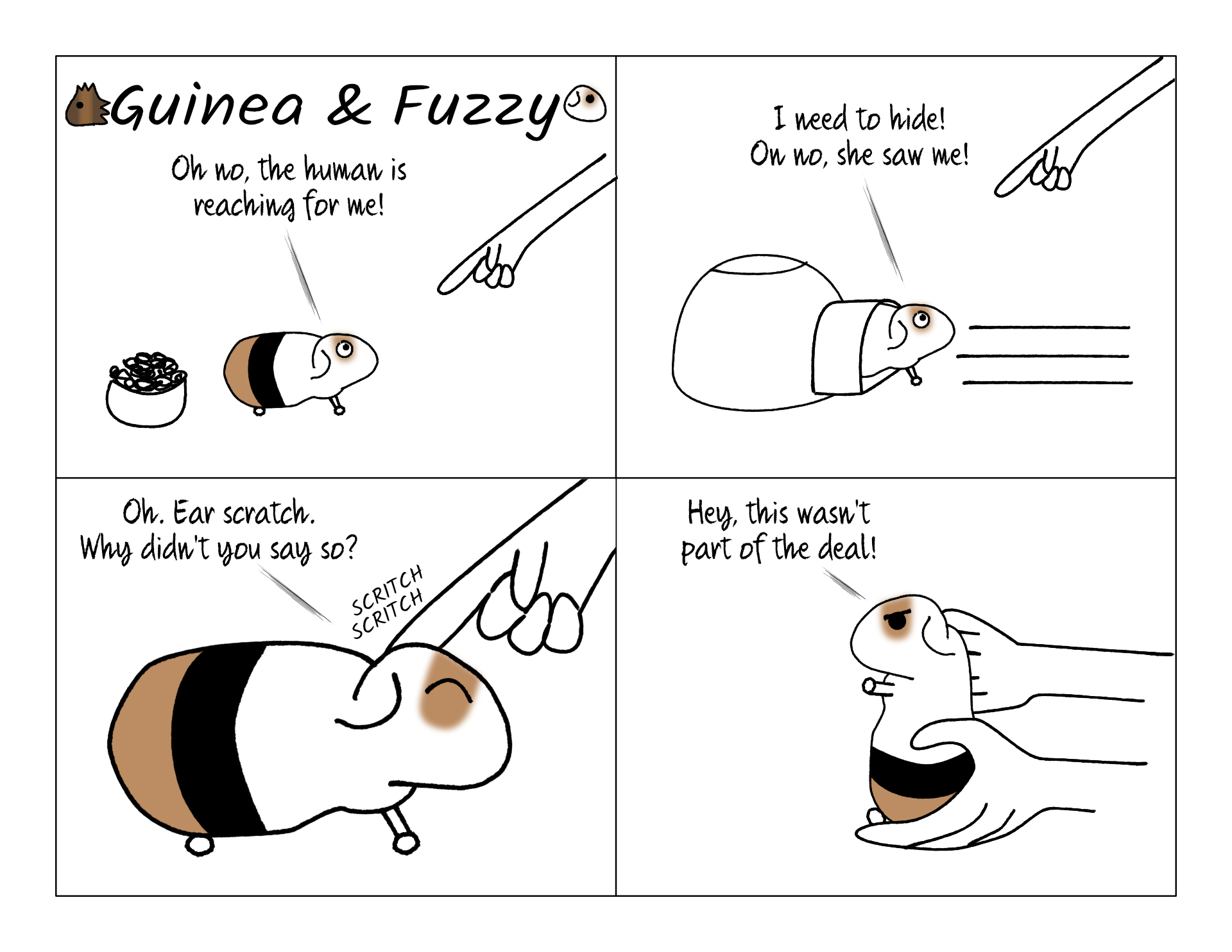 Even big, tough Fuzzy. He finally got used to the idea that he'd get ear scratches in the evening and he'd actually run and out wait for them. And he also really enjoyed his lap time, lying peacefully on his back. But if you went from "scratch position" to try to lift him up, he'd definitely try and run away. And suddenly right now he's not even open to ear scratches any more. But I'm working on that.