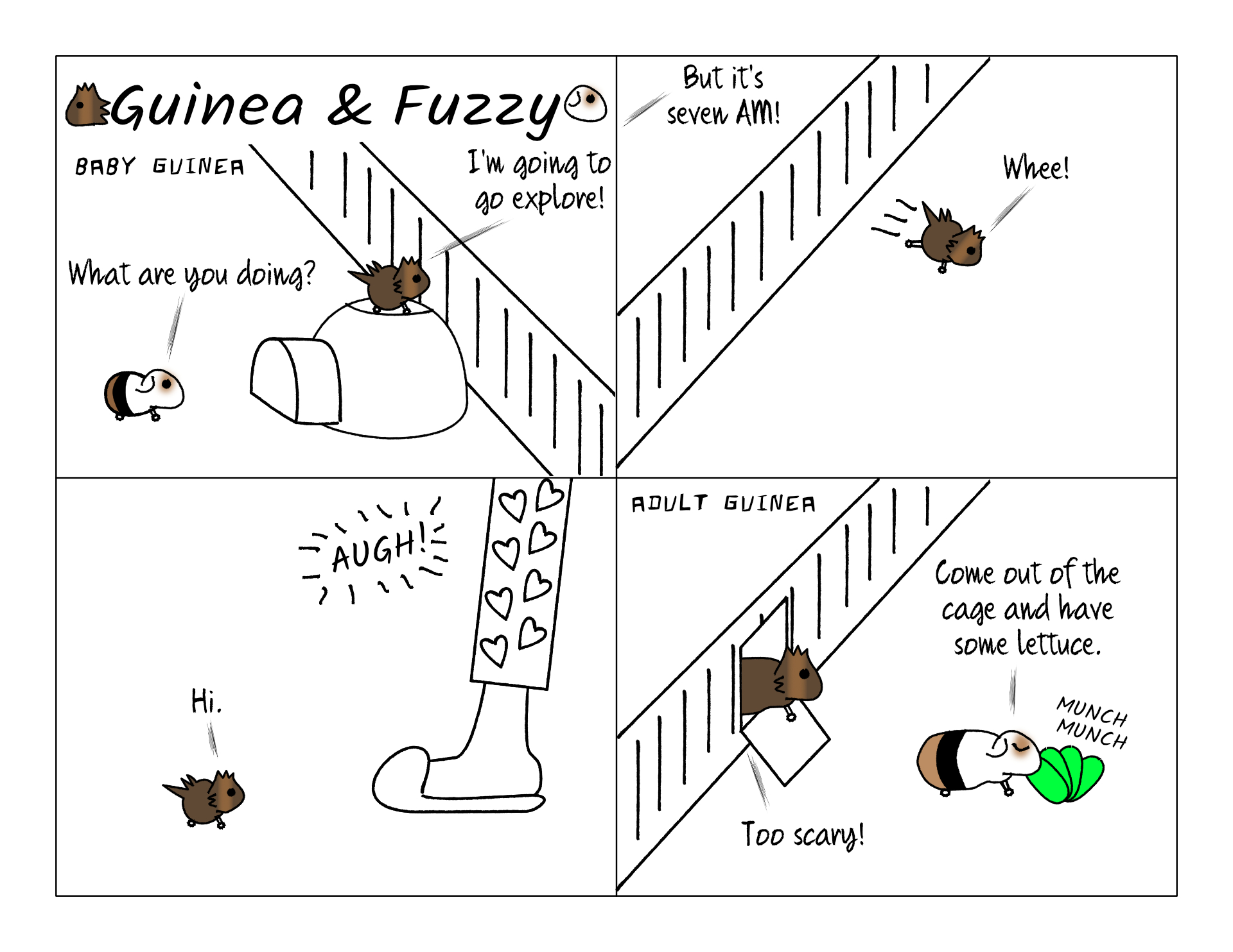 This only happened once. Guinea used his pigloo as a platform and somehow managed to leap over the side of the cage at night. He apparently didn't go far, as he was still wandering around the middle of the room the cage is in, in the morning. He actually ran up to great one of us, and everyone else heard "GUINEA!!!" all of a sudden early in the morning.