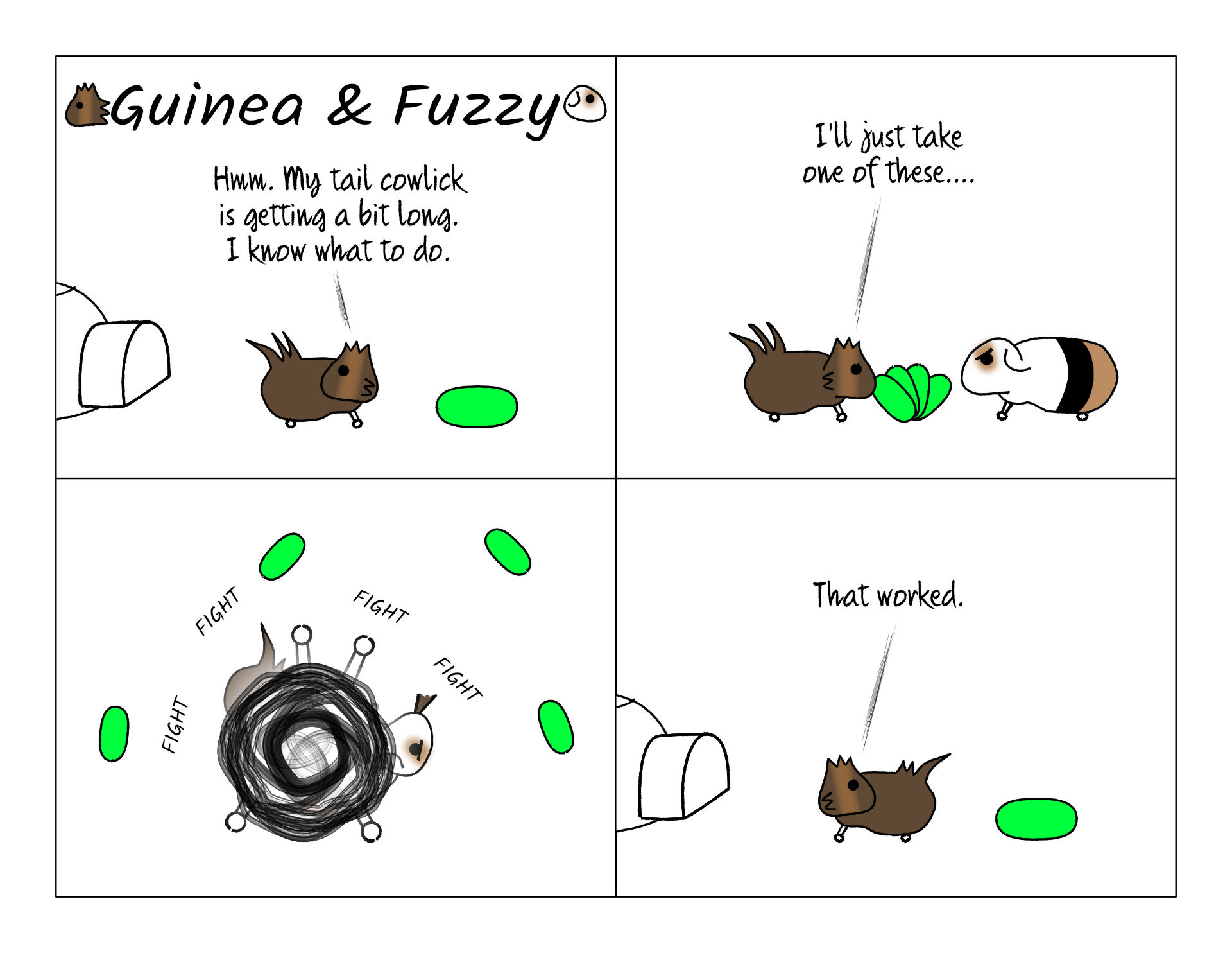 Fuzzy hasn't really chomped a big hair ball of Guinea since he was a baby, so this is definitely an exaggeration. But they did occasionally argue and fight and once in a while go for a bite of fur. But no one ever got hurt.