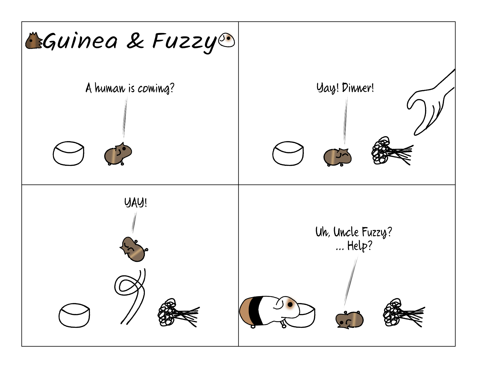 Potato is a serious pop-corner. When guinea pigs are happy, they sometimes leap straight into the air, and that's called popcorning. Potato is the most energetic pig now, and often popcorns after being served dinner.