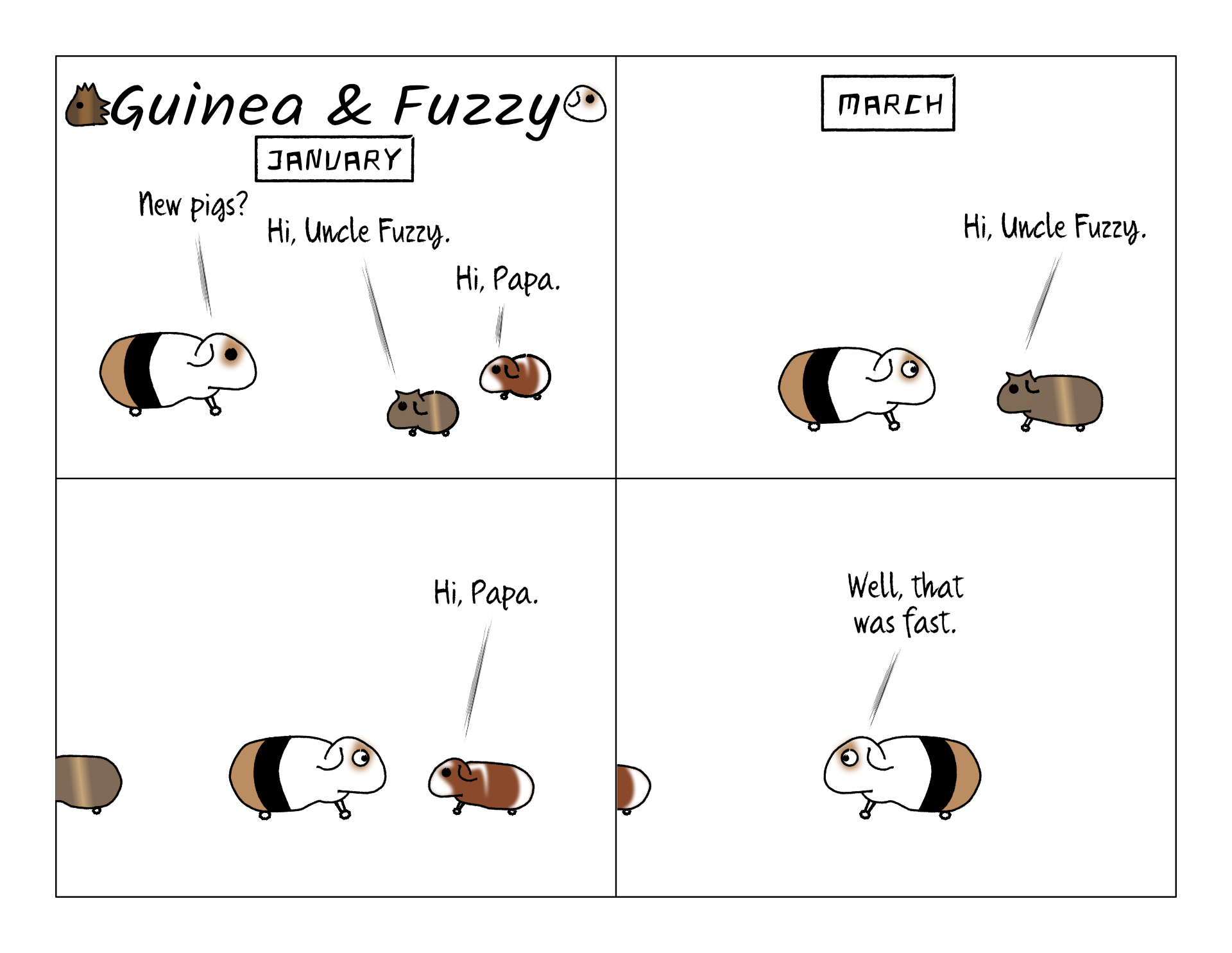 Guinea pigs really do grow fast. When we first got Bean and Potato, they were so tiny. You could easily hold them in one hand! Now, they're nearly adult pig size, and it only took three or four months to get there.