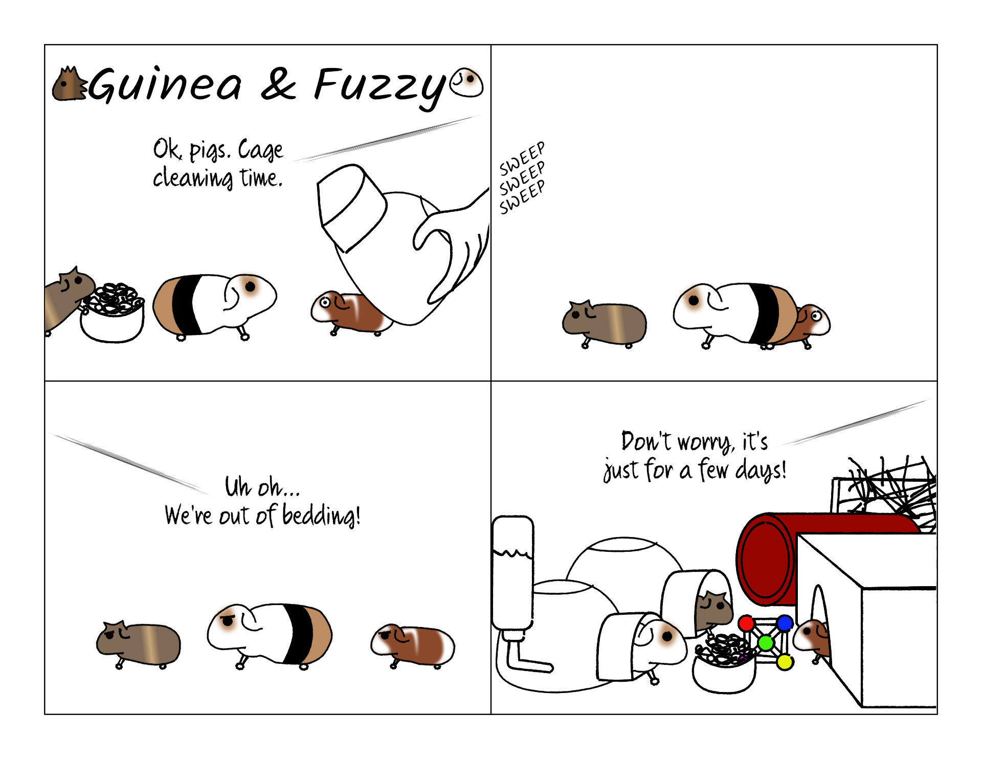 Recently we accidentally ran out of bedding on cage cleaning day. The old bedding had already been removed and thrown away before we realized there was no new bedding. Fortunately we have the blanket on one of the two halves of the cage, so we just moved everyone to that half and placed an emergency two day bedding delivery order.