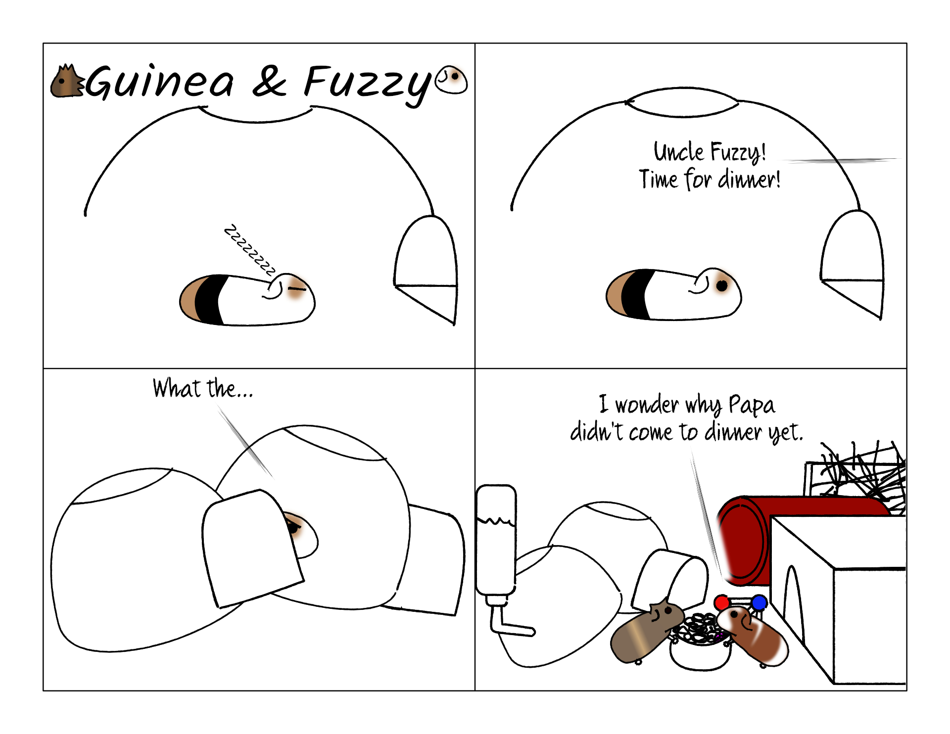 When we had to squeeze all the pigs into half the cage temporarily while we were waiting for replacement bedding, we also had to squeeze in all three pigloos. If they didn't each get their own place to sleep, there could be serious fights. We arranged all three pigloos around the edges and put the pellet bowl and hay in the middle between them. It left very little room, so when the pigloos shifted the entries would be blocked!