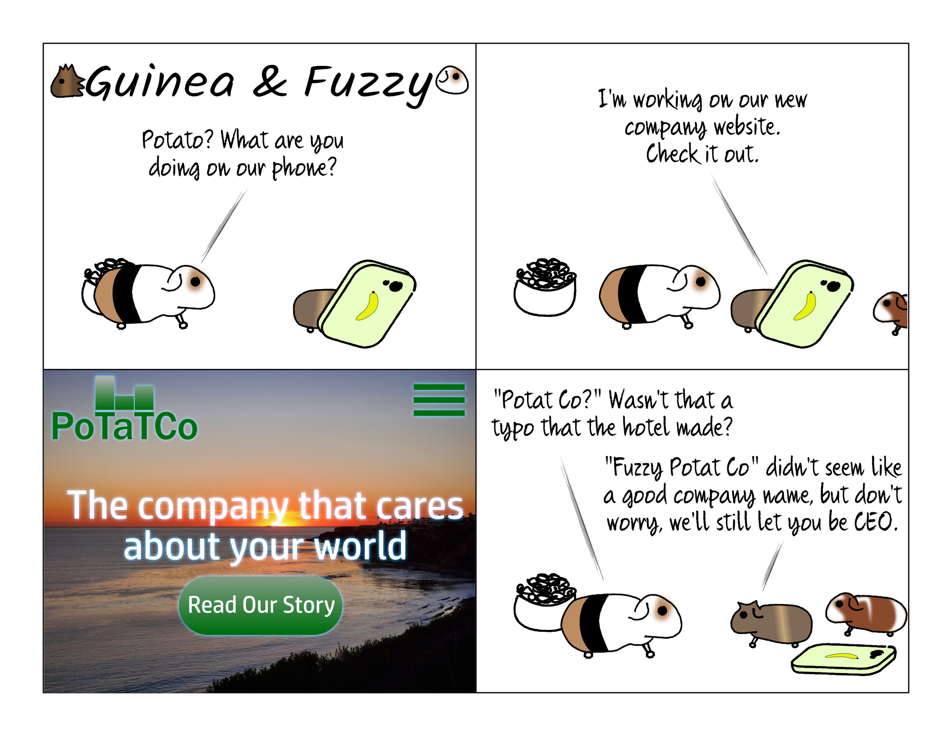 PotatCo really is a great company name. I'm not sure what "the company that cares about your world" would actually do, but I'm sure PotatCo would do it. By the way, the "tat" is pronounced like mat or bat. It's not "Potate Co."