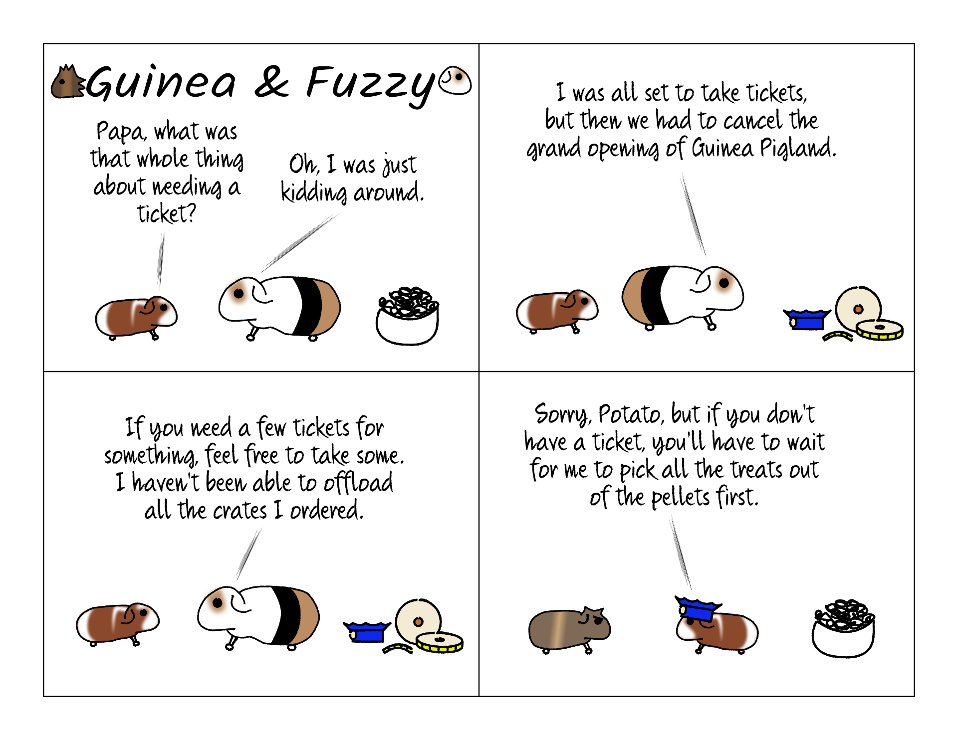 See, Fuzzy is just messing around, he wouldn't scam Bean out of food. (Or would he?) Naturally if you're building an amusement park, you'll pick up a few crates of tickets. How many tickets would it take to ride the pellet-bowl flume, or Pigrassic Park?