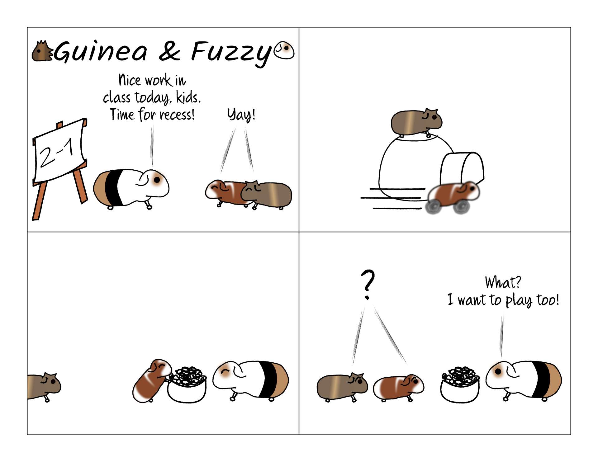 Fuzzy is not that active, but sometimes he does like playing with the younger pigs anyway. Usually he just watches, but sometimes he runs around with them, or they play "musical pigloos." And of course he always has energy for a little bit of teeth chattering.