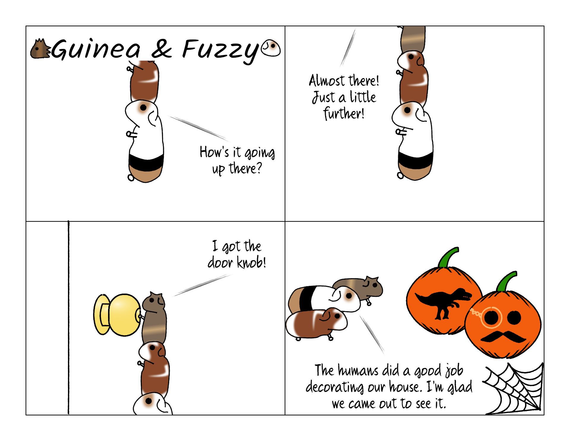 The comic buffer strikes again. Yes, I drew this comic on Halloween. Those are our actual pumpkin designs. We also decorated with fake spider web and bony arms in the front yard.