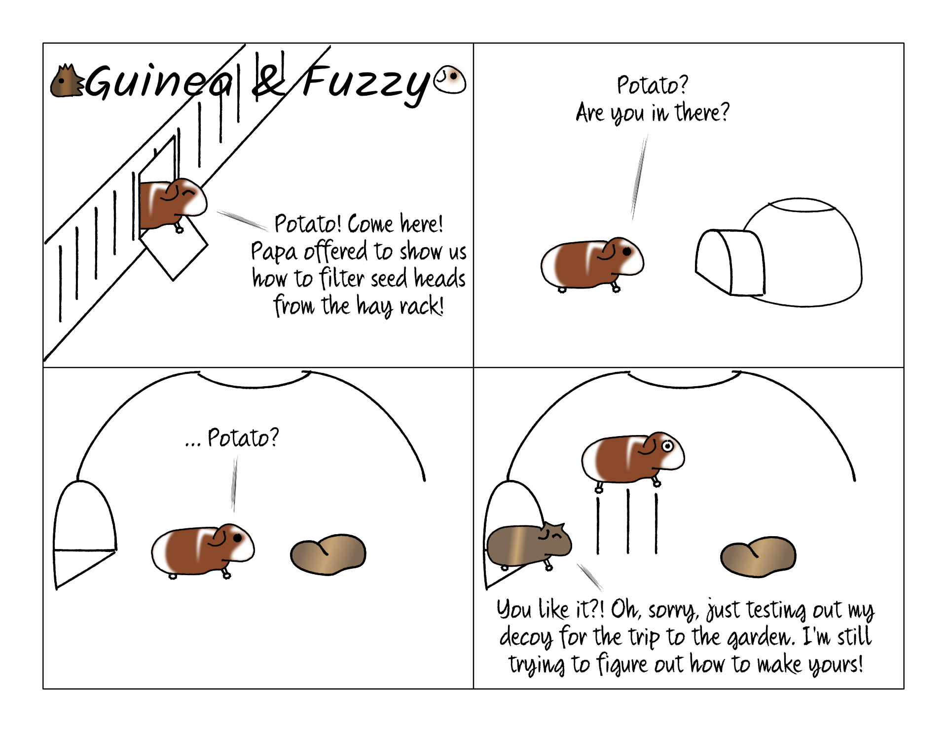 Coco Bean may be the right color, but he doesn't really look like a cacao bean. In fact, it wouldn't even be possible to use a plush guinea pig as his decoy, since his pattern is so unique. Fuzzy has a slightly more common color scheme. Although he's way bigger than most stuffed animals.