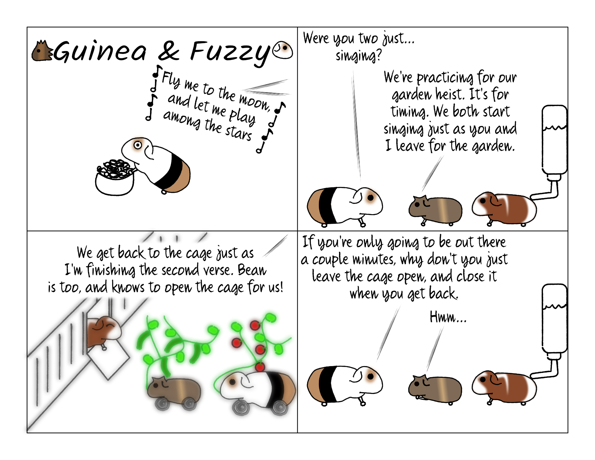 This isn't really Potato's fault. It's not that he had to come up with some plan to get the door open for no reason. It's that I had to come up with some excuse for them to time their escape by singing, because I thought the idea of Potato training Bean to sing was funny.