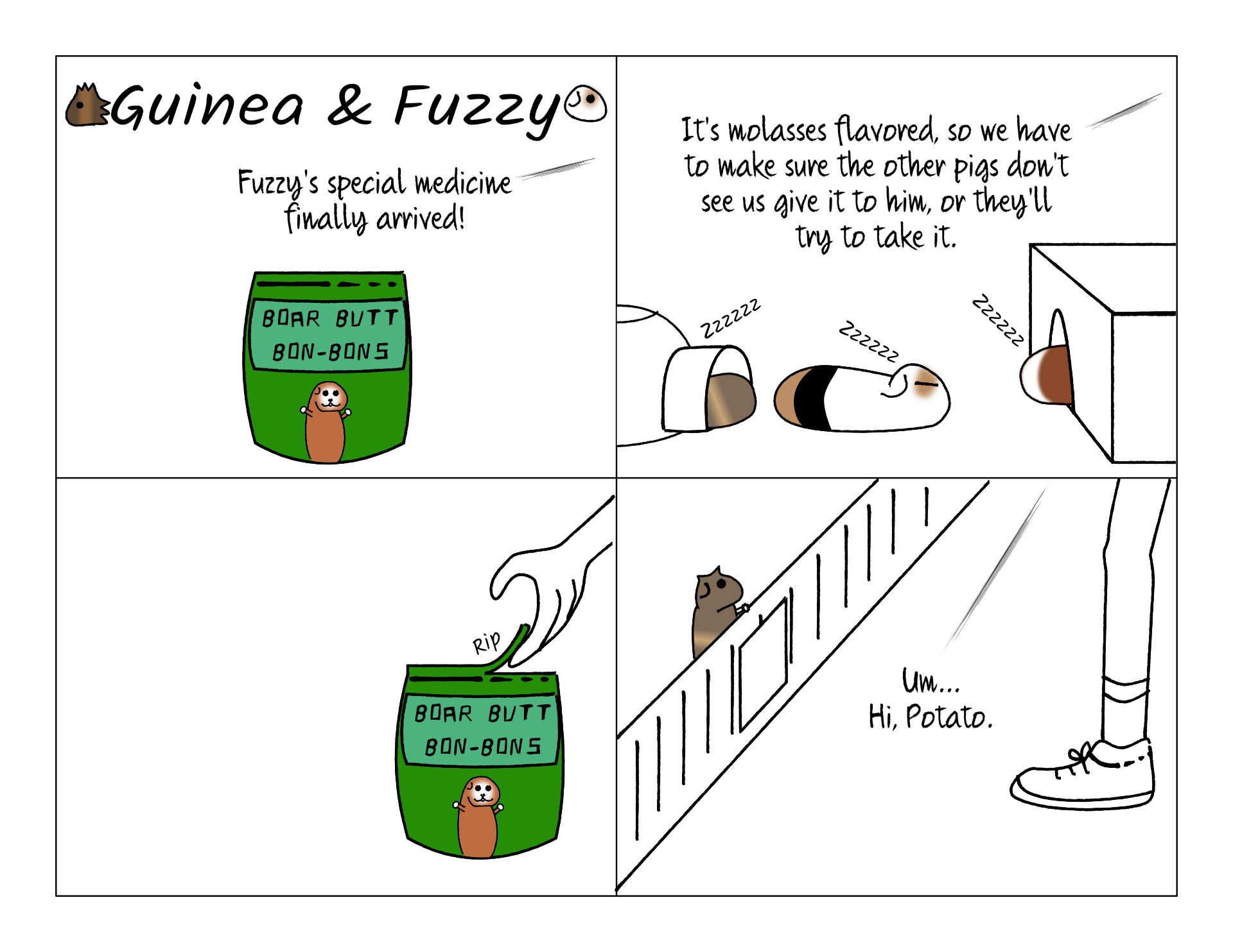 Poor Fuzzy. He's an older pig, so he has minor medical concerns. When he was seeing the vet for his sebaceous cyst and his punctured cornea, she also told us he has "impaction." Severe constipation, in other words. It's apparently common in older pigs, and it's a little different than in humans, since they have a special "fermentation sack" that just gets blocked up, so it's not immediately dangerous. It can turn dangerous if not dealt with, though, so it requires regular "maintenance." After doing this a few times, we asked the doc what we could do to reduce the frequency we need to help him out. (It's quite smelly.) She suggested special high-fiber food treats. We try not to let the other pigs have any, so we don't give them the opposite problem. But Potato noticed right away when we were opening a bag near the cage.