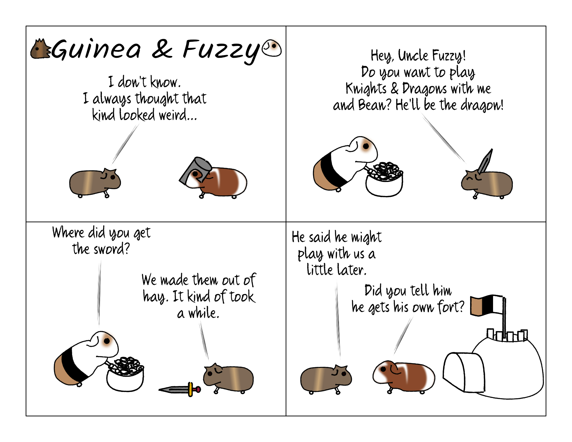 The baby pigs are generally more active than Fuzzy, but I'm not sure they're actually more playful. All three pigs like to play when they feel safe, and the babies get skittish and hide more often than Fuzzy. But since Fuzzy's older, he gets tired and needs to have a lie down more often. I wonder what kinds of games they like to play together other than "Potato Licks Fuzzy's Eyes."