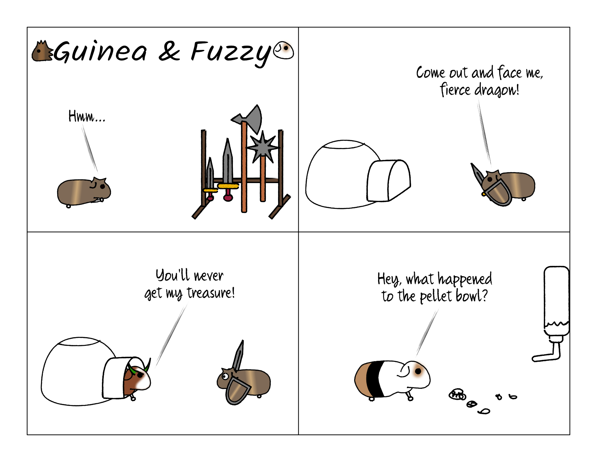 This is one of Bean's favorite tricks. He moves the pigloo over top of the pellet bowl so he can hoard it all for himself. Also because he doesn't want to leave the pigloo.