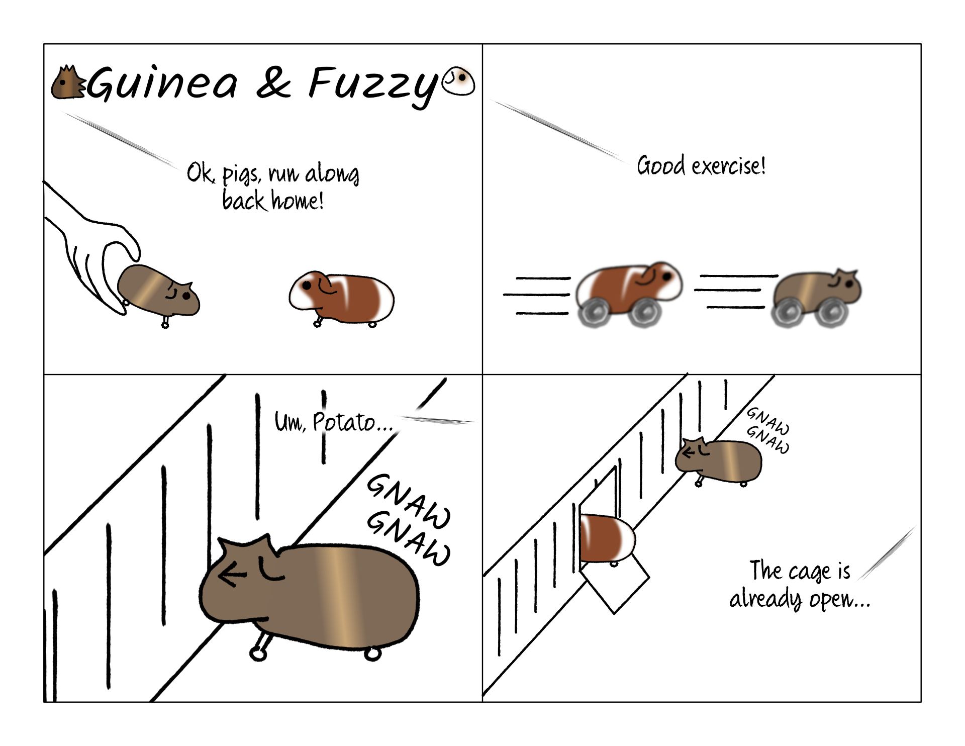 Potato likes to gnaw the cage just like Guinea used to. But where Guinea used to gnaw the cage to get our attention, Potato always gnaws it right after lap time, when we let him run back home. Instead of going inside, he gnaws the bars like he's trying to escape. Except that he's already out trying to get in. I don't think it's because he's not smart. As we've already established he's the smart one. He must be trying to tell us something, or just strengthen his teeth.