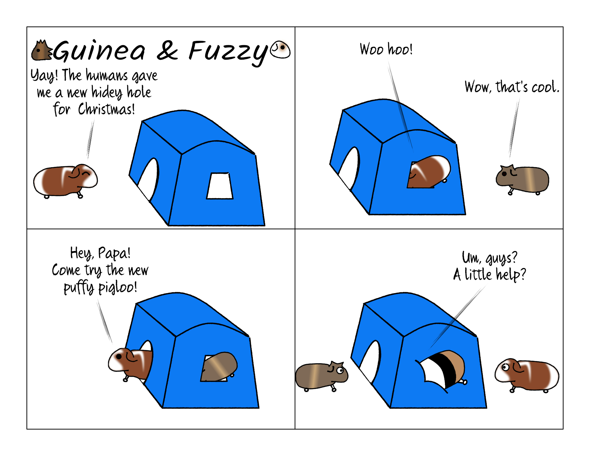 Bean's first ever Christmas gift was a "Frisco Plush Small Pet House." It's made of puff material and has a faux-fur interior. You might think that would get really nasty really fast, but it's surprisingly absorbent and durable. We don't leave it in there all the time, but we'll put it in there for an entire daytime once every two or three weeks, and the pigs try to take good care of it. They don't do their business in it too much. By the end of the day it's a little dingy and soiled, but it cleans up perfectly in the laundry.