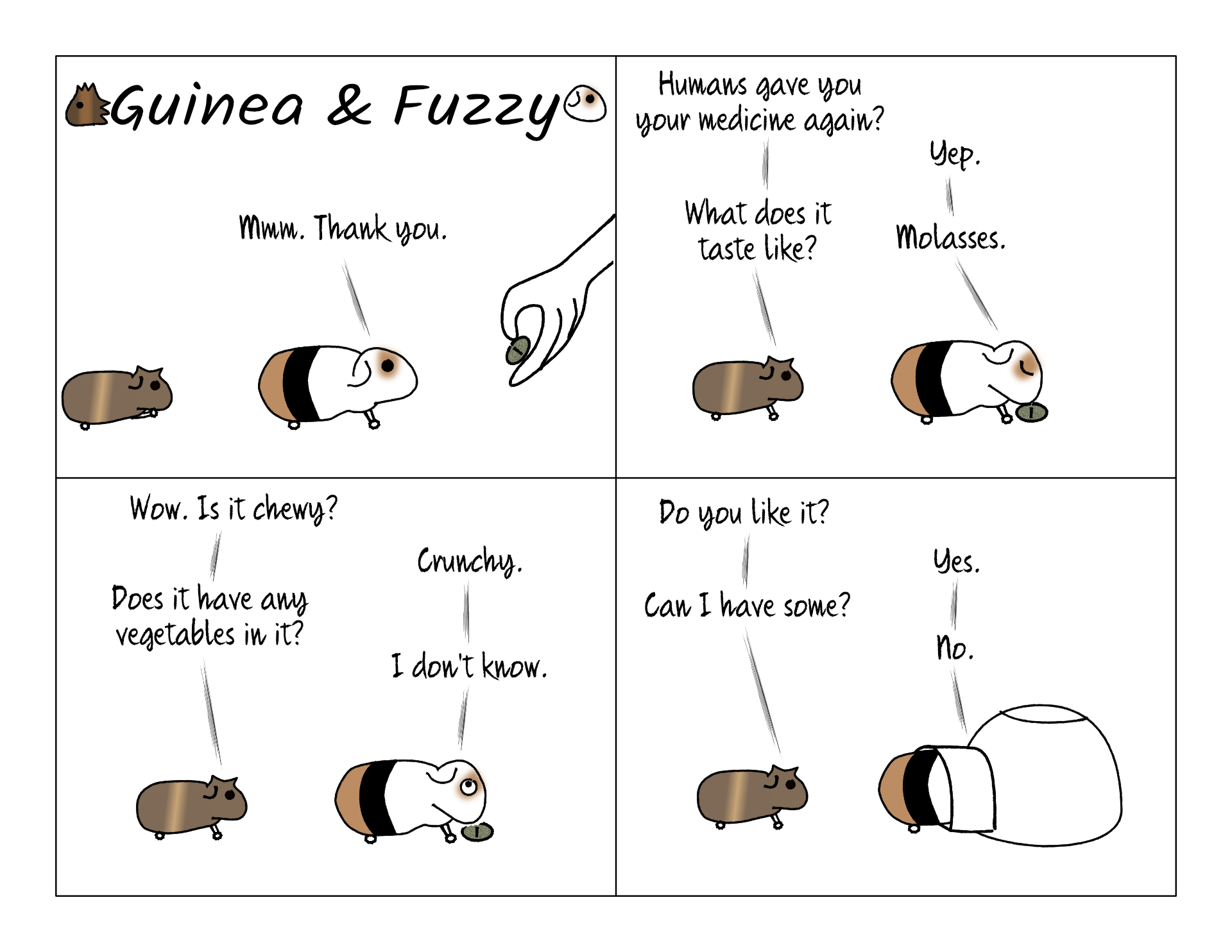 Potato is always interested in Fuzzy's medicine pellet. Even when he's not trying to steal it, he's looking at Fuzzy hopefully. Maybe Fuzzy will just decide to allow him to have some? Fortunately Fuzzy never does, he just ignores him and tries to find a corner facing away from him to eat it. Funny when the corners are already occupied, he just carries it past everyone trying to find a private place to eat.