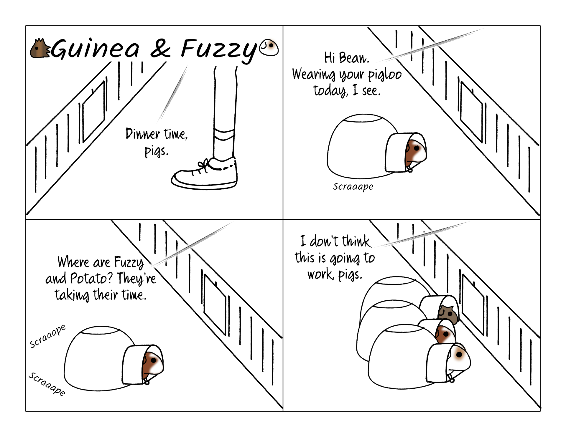 Bean often shows up for dinner wearing his pigloo for protection. I'm just used to it. But at least once the other pigs got inspired and they both showed up wearing pigloos too!