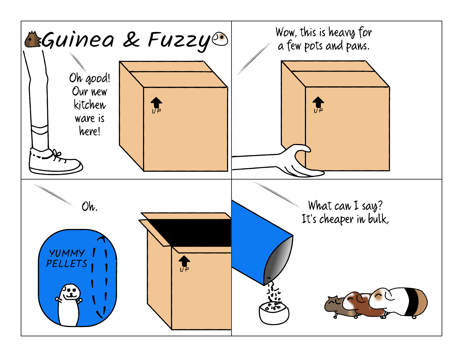 Pellets are worse in some ways. A large bag of pellets is 10 pounds, and I have to order two to get free shipping... And PetCo's free shipping is Door Dash, so some poor driver has to drag twenty pounds of pellets to our door once every couple of months!