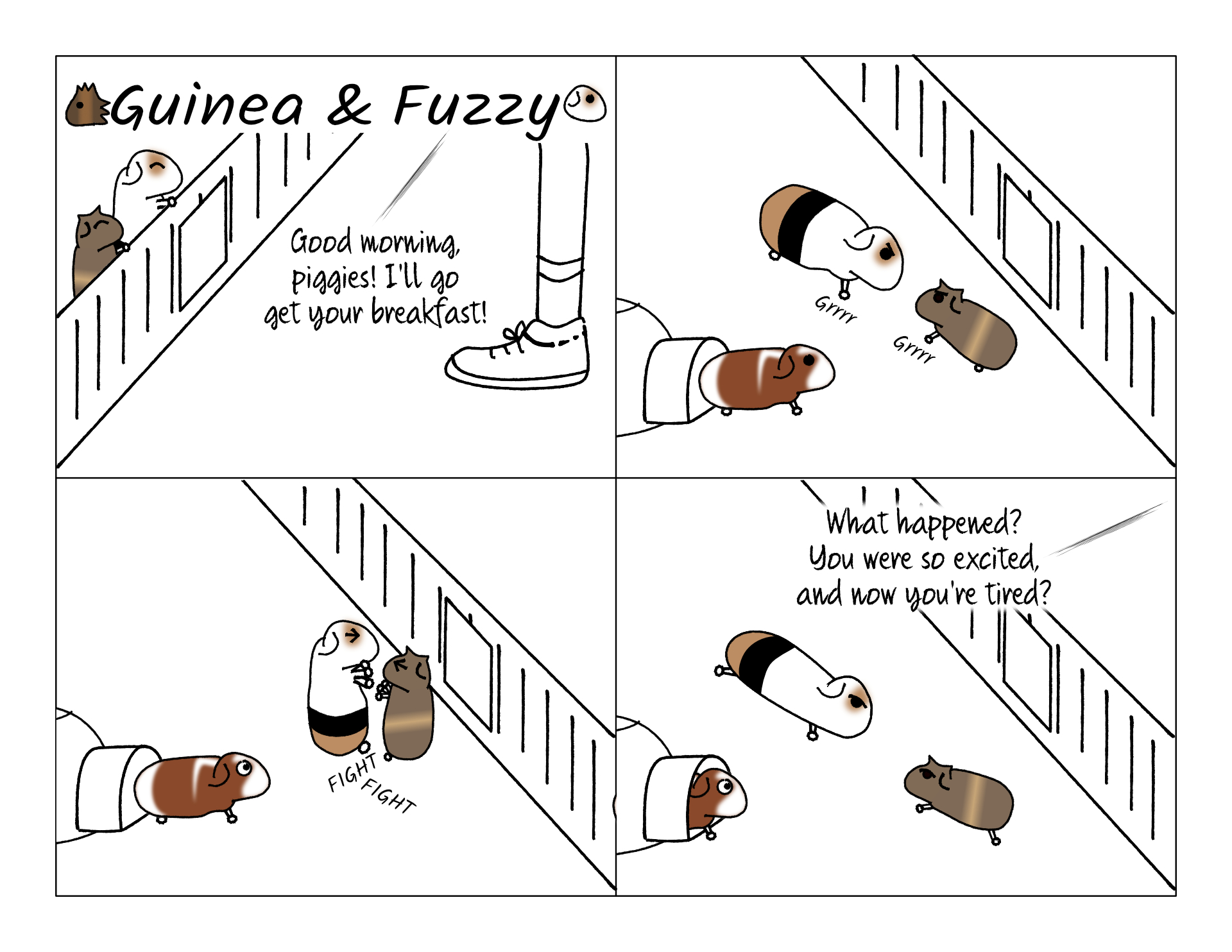 Usually arguments are forgiven and forgotten just before meal time. Everyone wants to concentrate on being good little pigs and getting the most food. But sometimes Fuzzy's and Potato's little arguments can interfere.