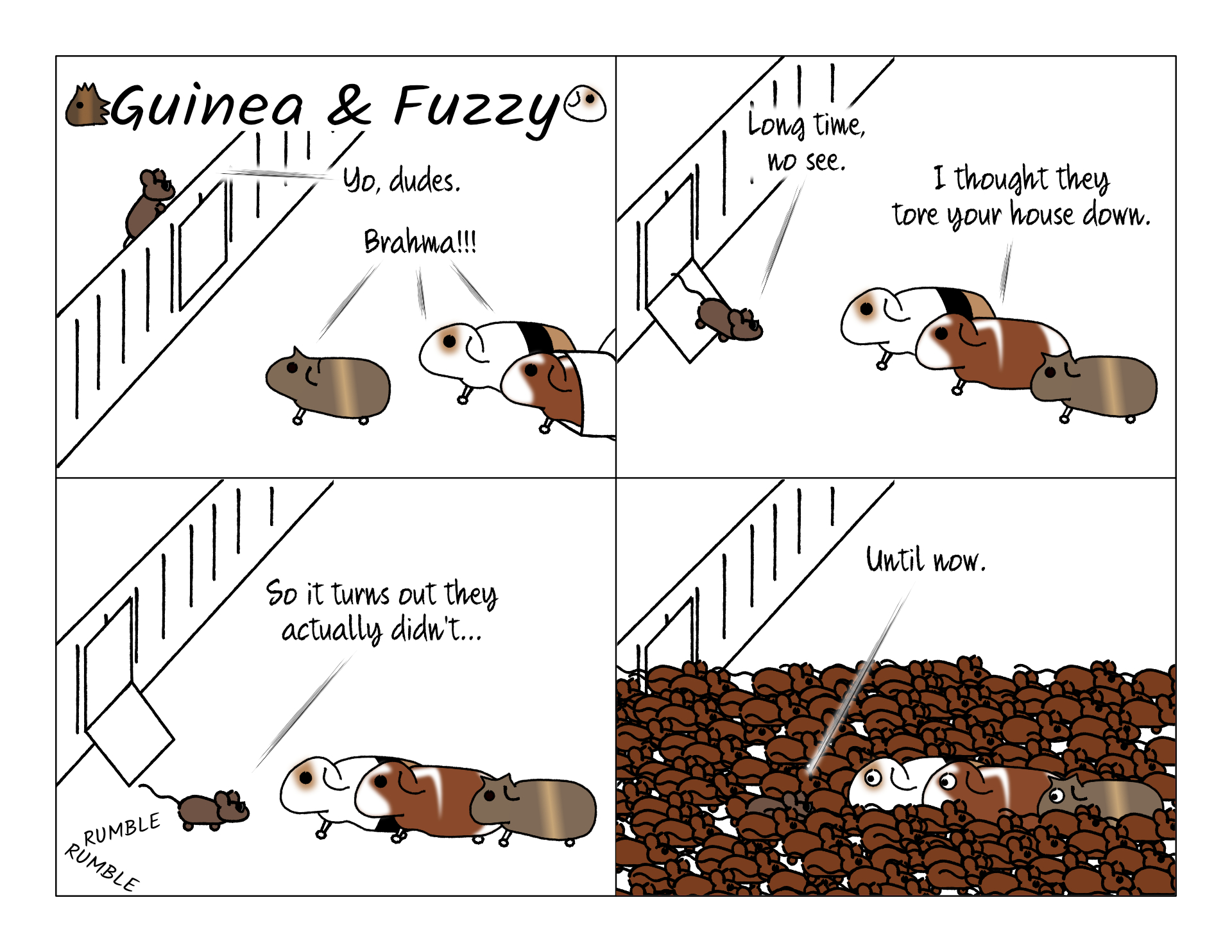 It was just Brahma, not a horde of rats. This comic was actually inspired by the horde of partying teens the police chased out of the house and through our yard while it was abandoned. Brahma is still a recurring character, however. Stay tuned to learn what happened to him and where he lives now!