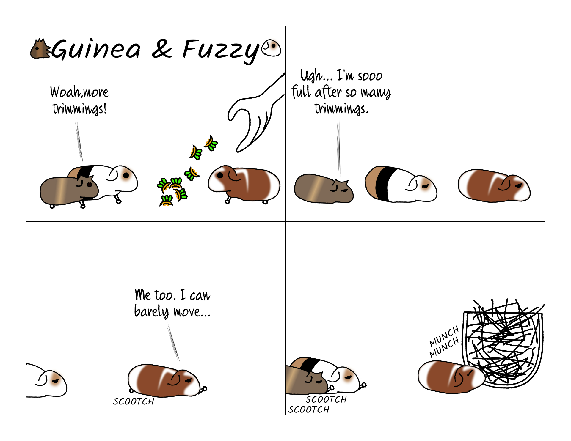 All of the guinea pig pet guides recommend you provide your pigs with "unlimited" hay and water. They're not messing around. No matter how many fresh veggies the pigs just ate, they always have room for more hay, too. Same with pellets, but the vet asked us to limit their supply to help control their weight.