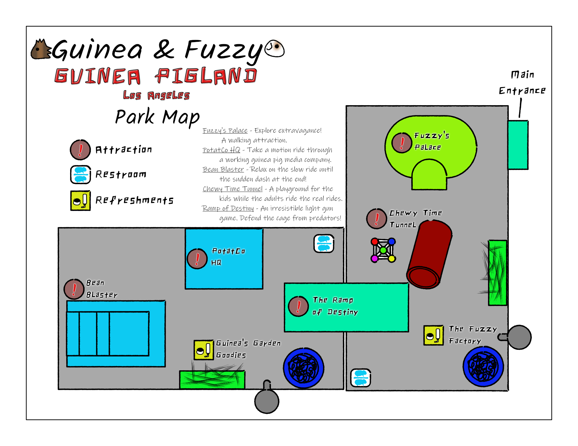 It's too bad Guinea Pigland never got to open due to local health ordinances. If it had, this would be the layout. I'm sure the pigs have a few thousand of these park maps stashed away somewhere.