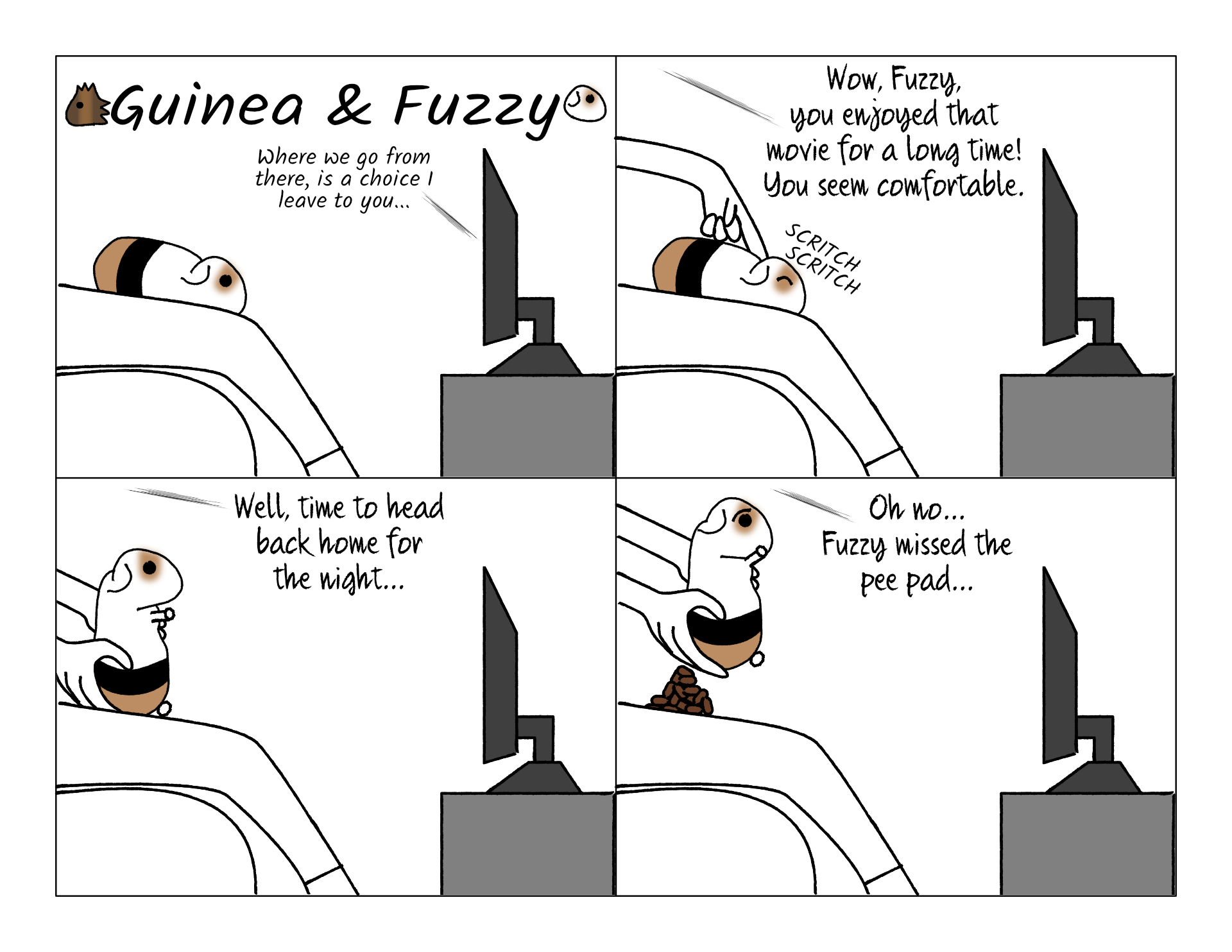 We had been watching a long time and Fuzzy was so calm and comfortable he had half fallen asleep during the movie. But Fuzzy has a bad habit of scootching backward to get more comfortable, constantly edging closer to the lap pad we got for him. I usually keep an eye on it, but this time even though he was technically still over the pad, he had produced such a large pile of stuff, including a big egg or two, it spilled over the edge and onto my pants. I definitely had to wash them right away, it wasn't pretty.
