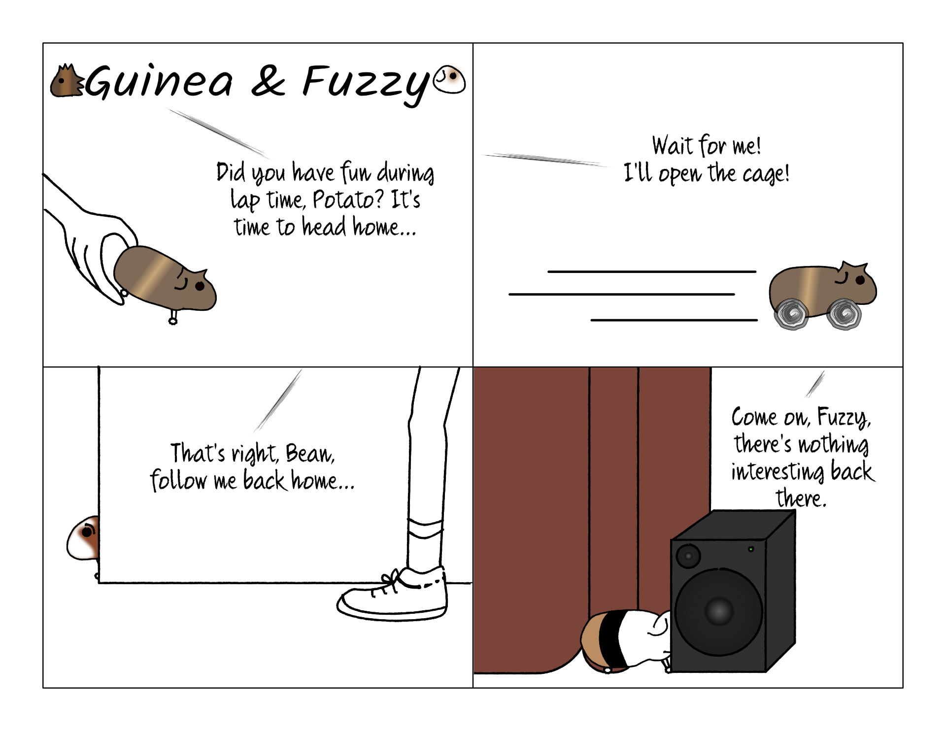 After lap time, we like to let the pigs walk back to the cage across the entire house to get their daily exercise. Potato knows exactly where he's going and doesn't hesitate. It's usually the cage, but sometimes he's on a mission to explore. Bean is a bit more cautious, but still, considering how exposed he is, he's fairly brave.