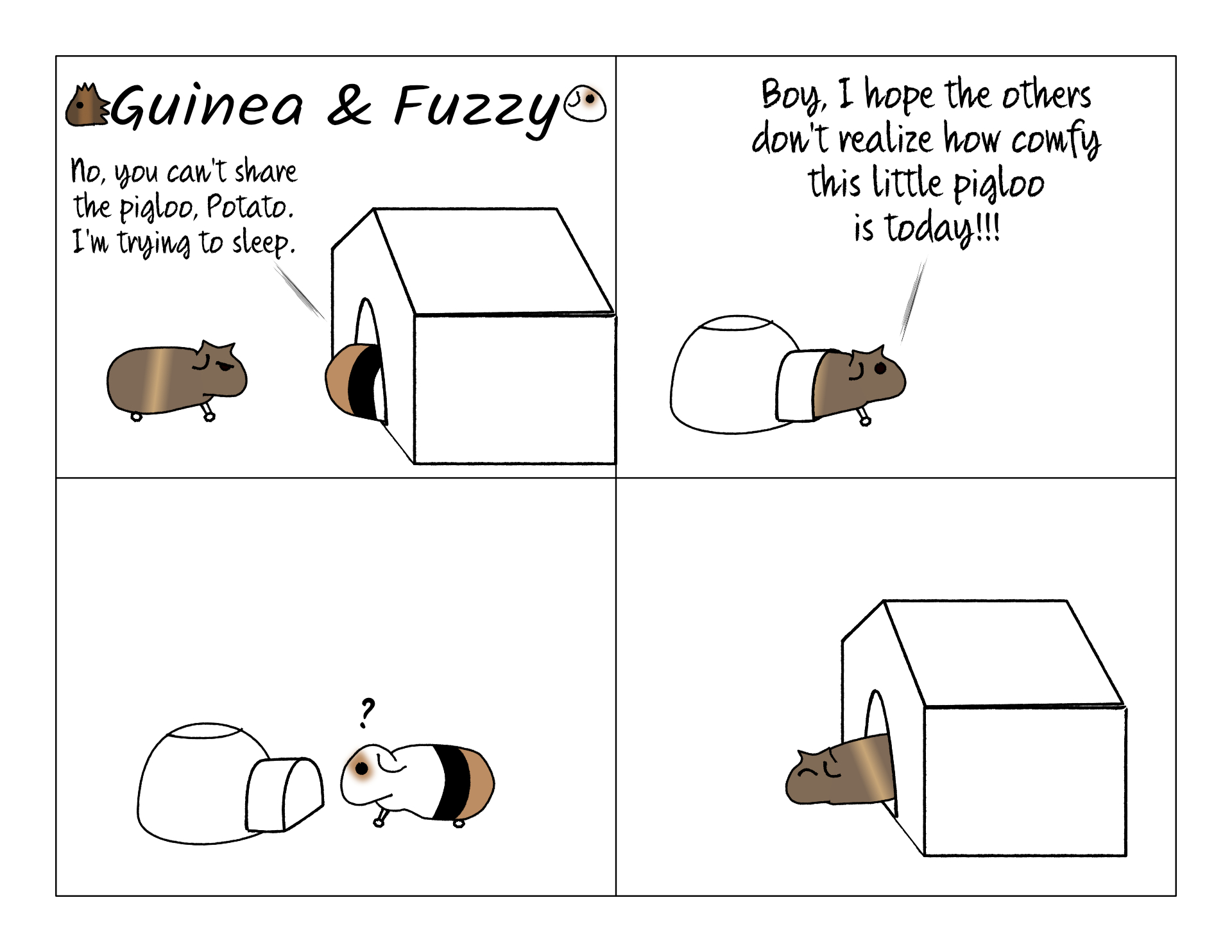 Potato is so clever. I've seen him do this at least twice. Fuzzy won't let him take the pigloo he wants. So he goes to a different pigloo and rolls around in it wheeking, until Fuzzy comes over to check it it. Potato happily lets him take his place, and then runs over to the pigloo he wanted in the first place.