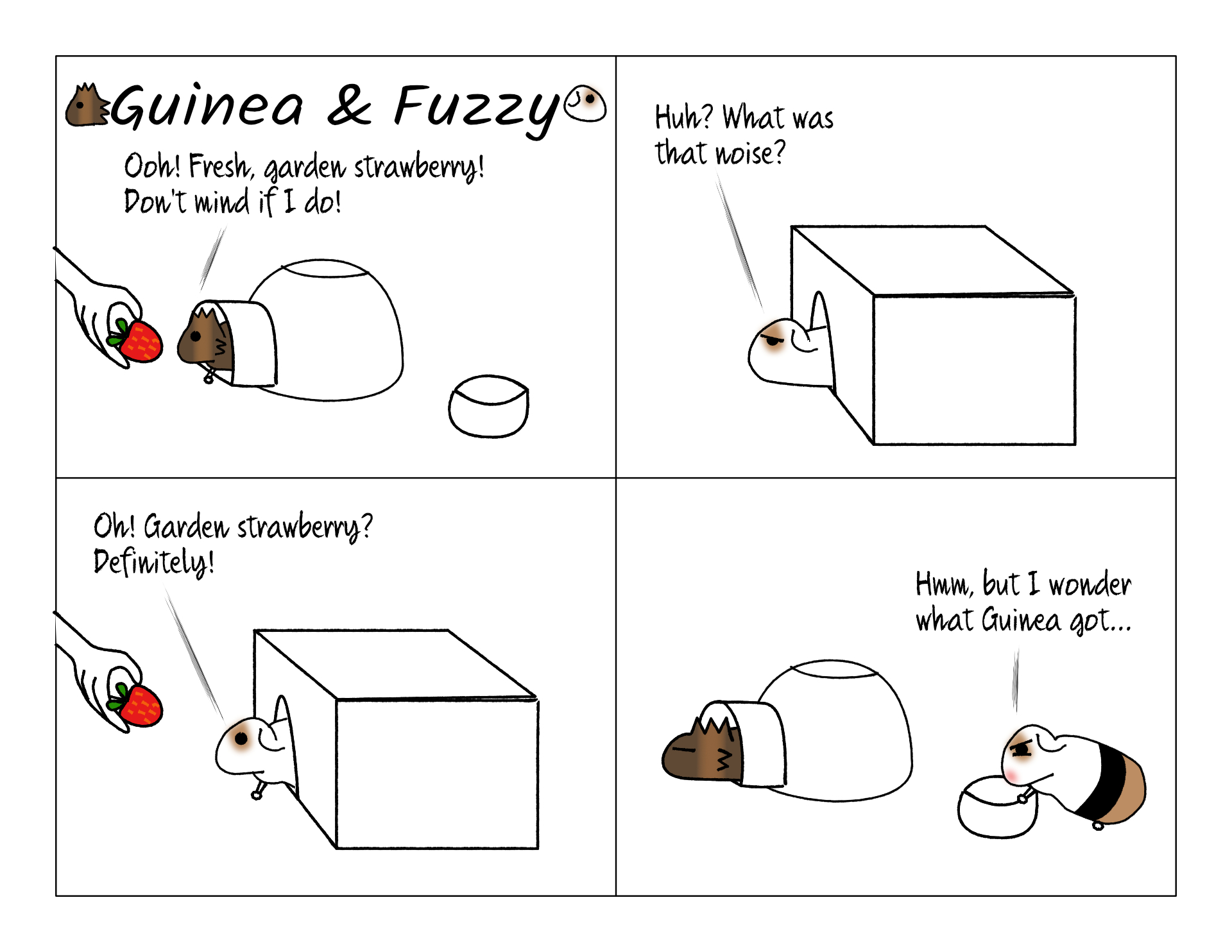 Daughter of comic #1 February 9, 2021 - 11:34amGuinea eats slowly so that is a bigger chance for Fuzzy.ðŸ¹ðŸ¥¬ðŸ’š |