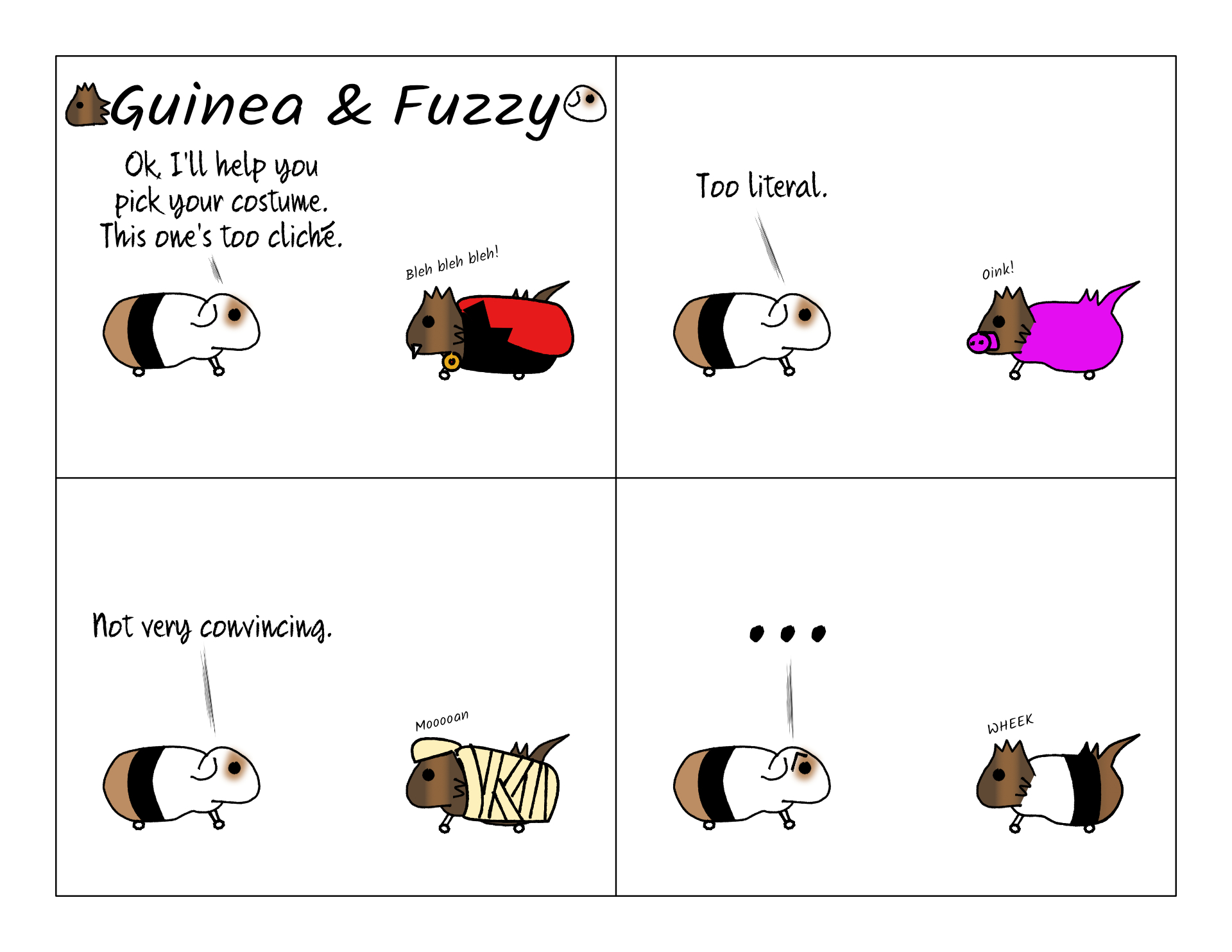 Happy Valentine's Day? Weird coincidence these Halloween comics lining up with another holiday. If the pigs really could dress up like something for Halloween, it would probably be vegetables. Parsley for Fuzzy and basil for Guinea.