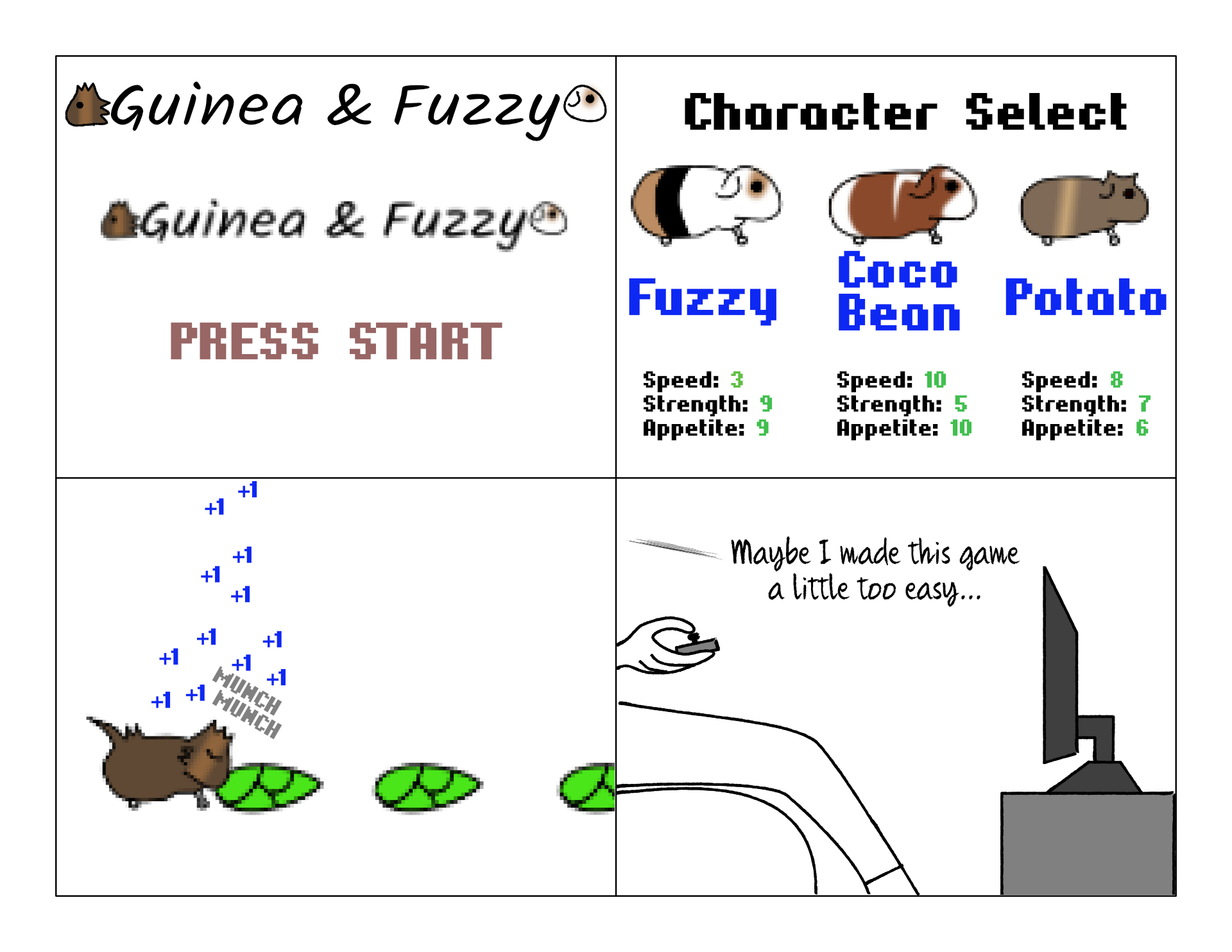 I've been tempted to make a game starring the pigs. Maybe a browser game you could play right on the website. But I wouldn't want to depict the piggies in danger, and without some kind of conflict it wouldn't be a very interesting game.